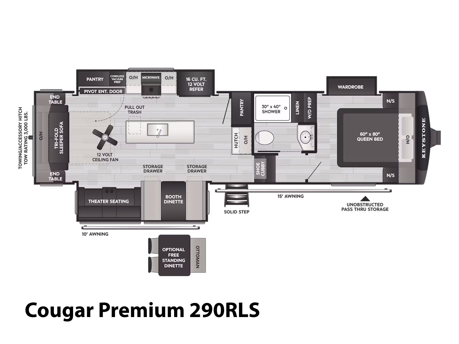 - Full pass through storage with LED light strip, power outlets and TV hookups