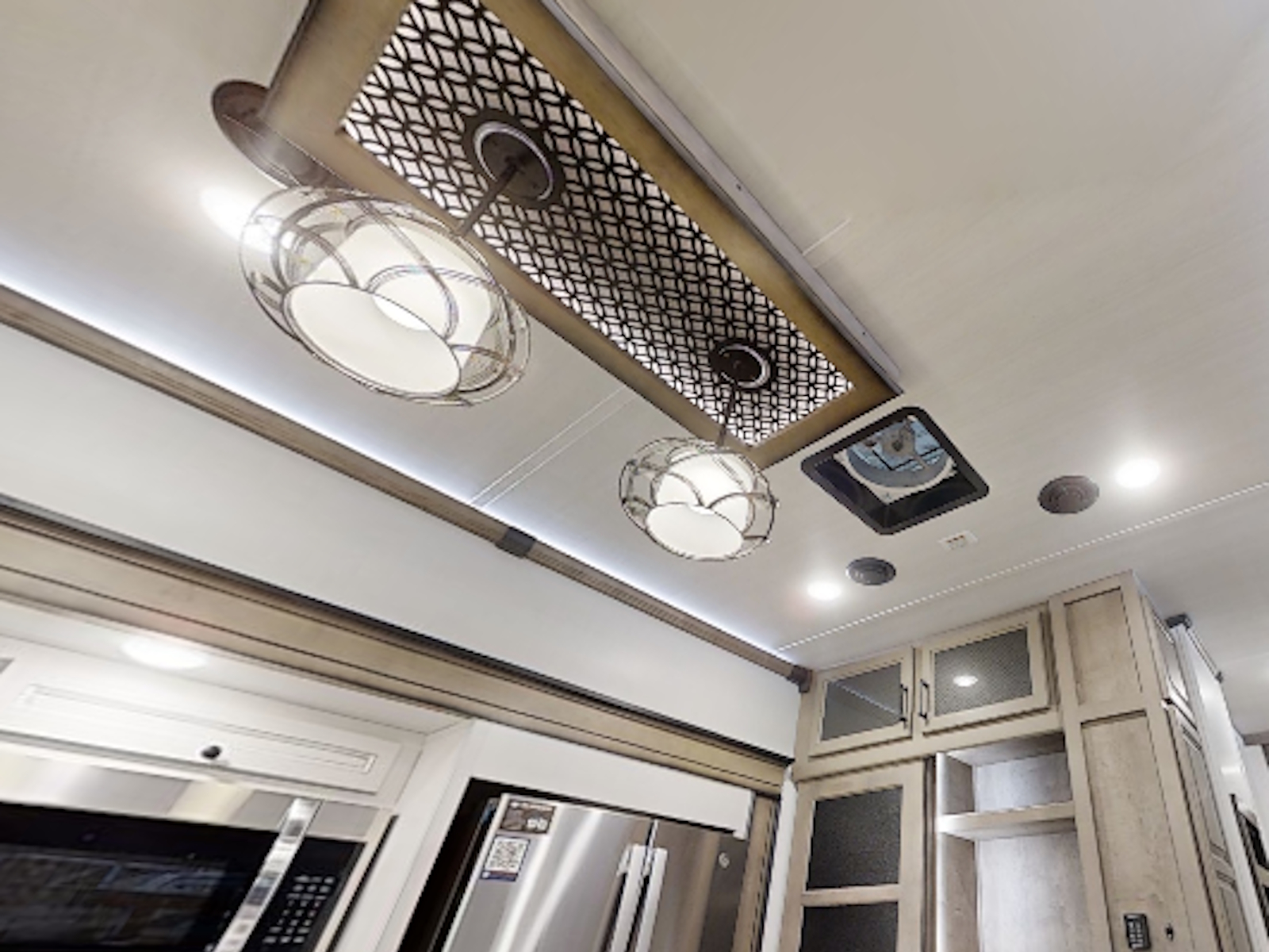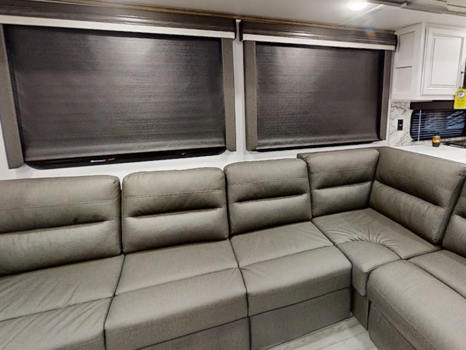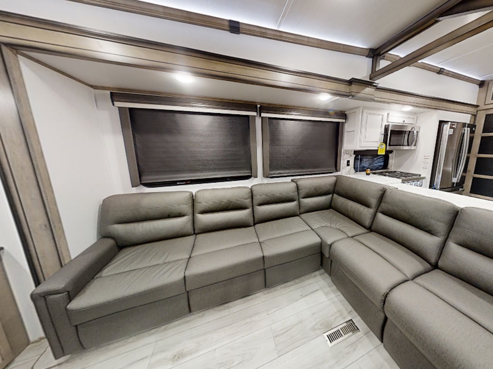 Beauflor® vinyl flooring throughout | Hardwood decorative slideout fascia | Reflective window shades built into window | Hardwood decorative window frames | Hardwood cabinetry, stiles, & framing | La-Z-Boy Furniture Package | Decorative backlit crown molding in living area, hardwood base molding in hallway and living area | 5K BTU decorative fireplace heater | Central vacuum