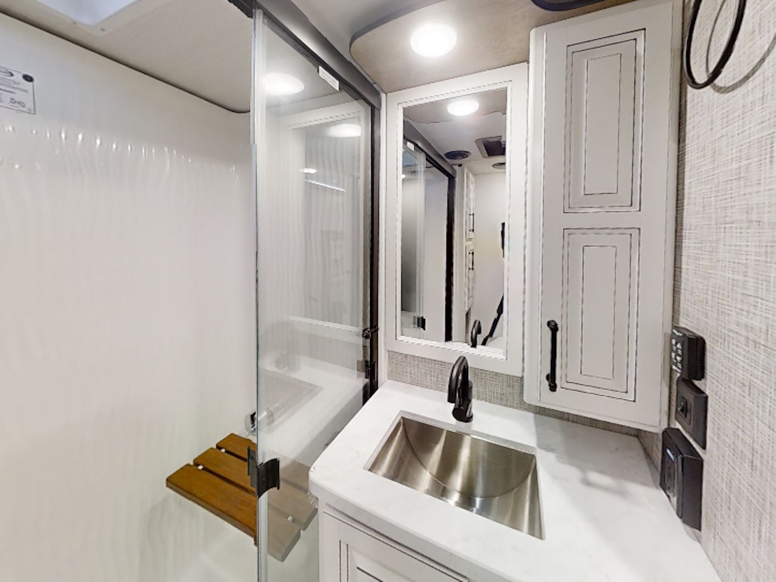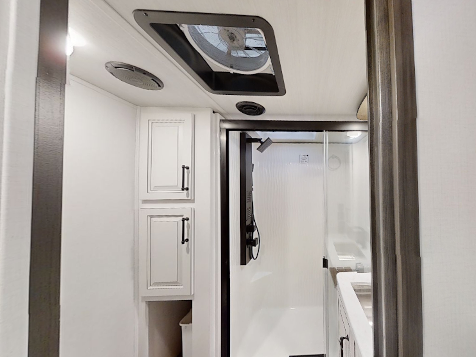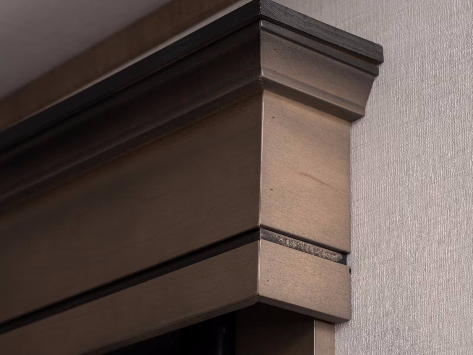 Beauflor® vinyl flooring throughout | Hardwood decorative slideout fascia | Reflective window shades built into window | Hardwood decorative window frames | Hardwood cabinetry, stiles, & framing | La-Z-Boy Furniture Package | Decorative backlit crown molding in living area, hardwood base molding in hallway and living area | 5K BTU decorative fireplace heater | Central vacuum