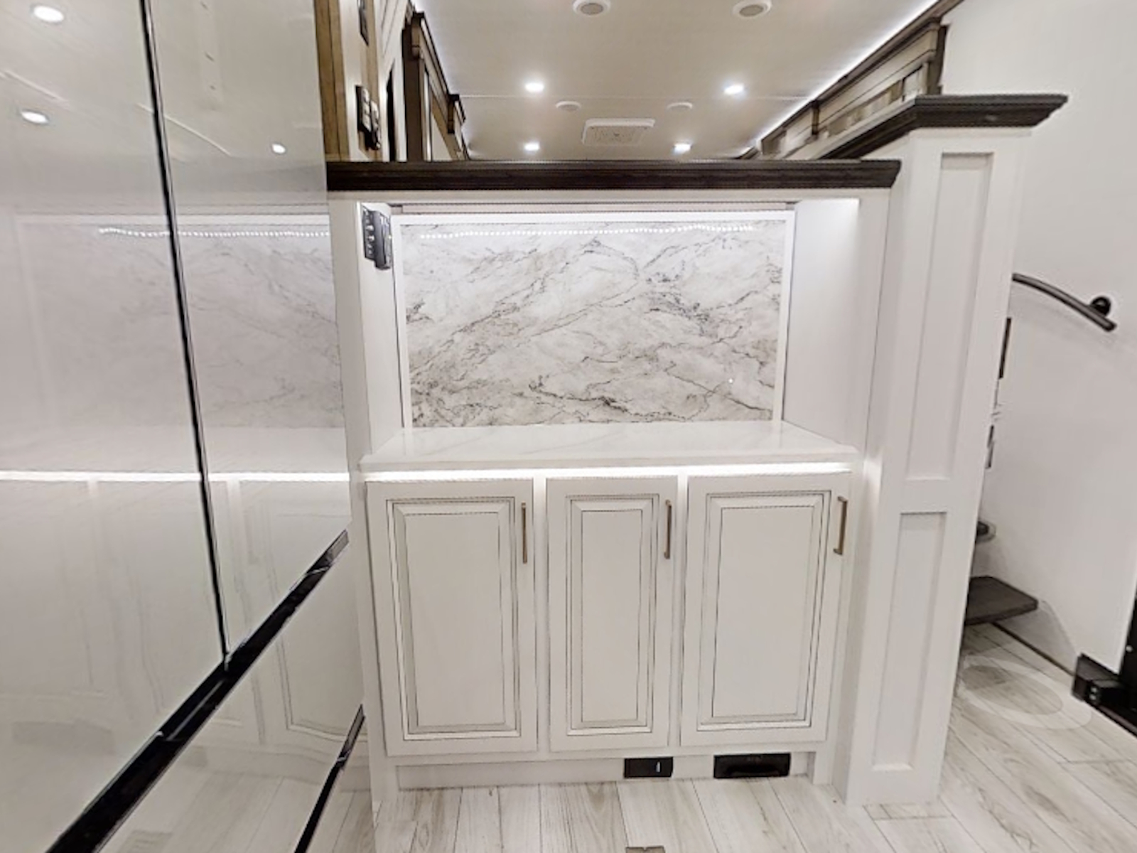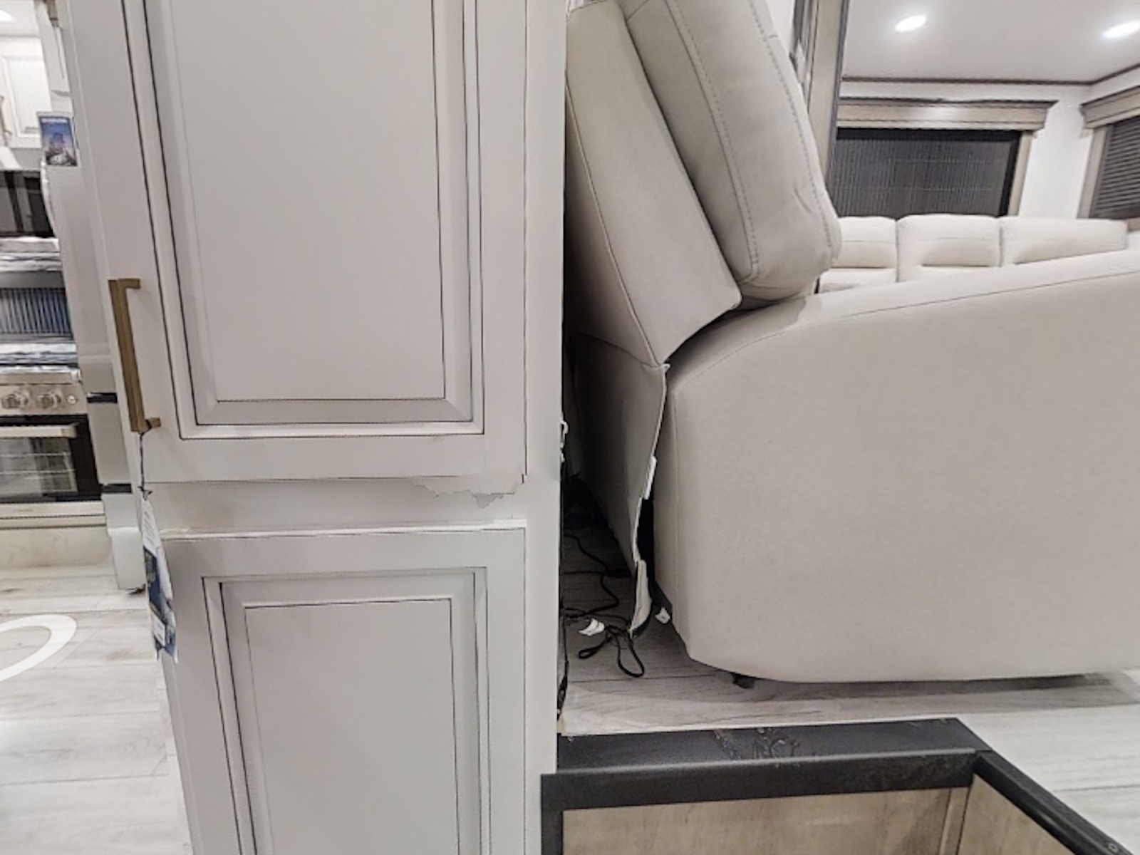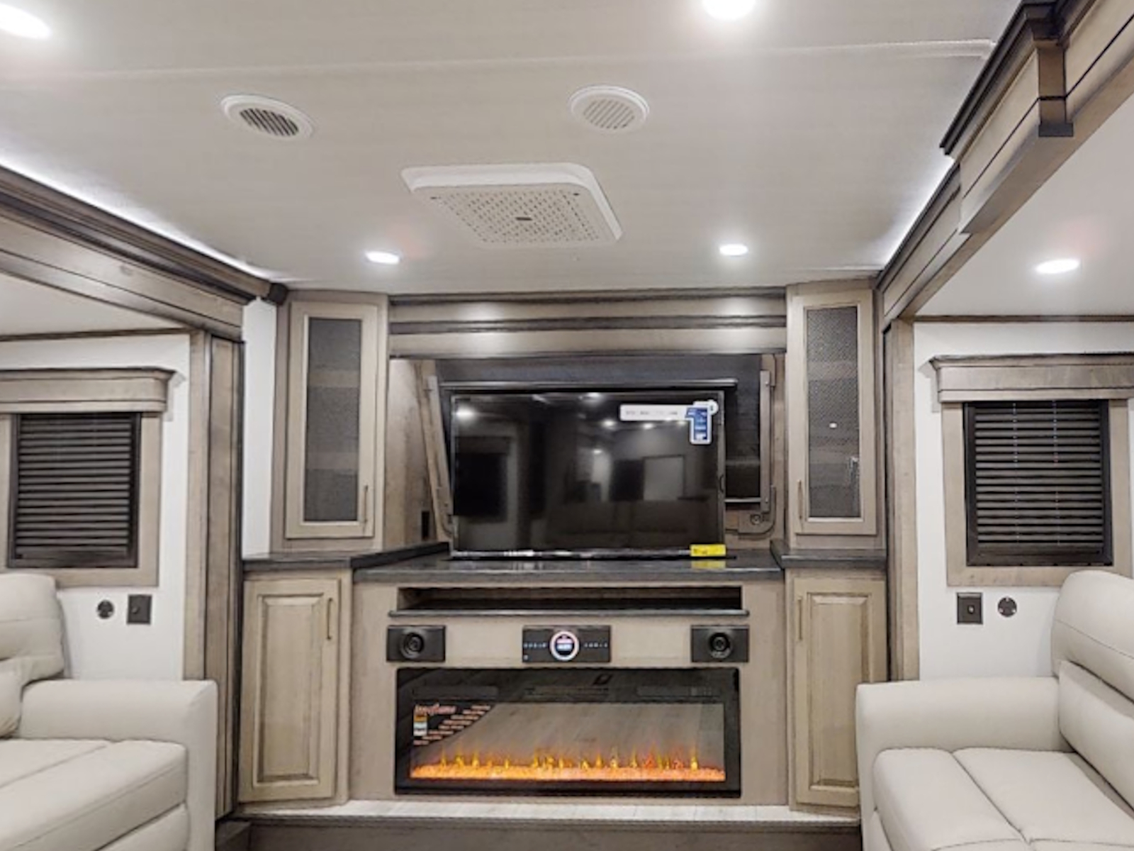 Beauflor® vinyl flooring throughout | Hardwood decorative slideout fascia | Reflective window shades built into window | Hardwood decorative window frames | Hardwood cabinetry, stiles, & framing | La-Z-Boy Furniture Package | Decorative backlit crown molding in living area, hardwood base molding in hallway and living area | 5K BTU decorative fireplace heater | Central vacuum