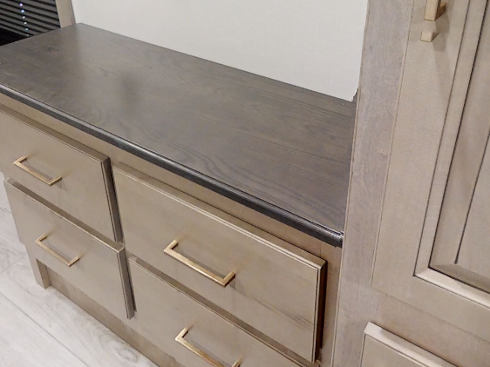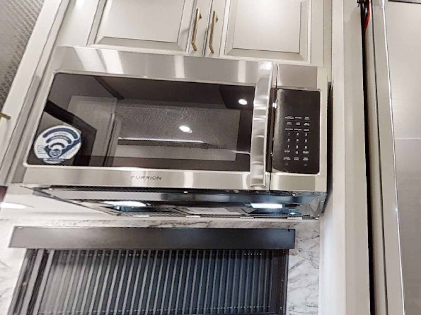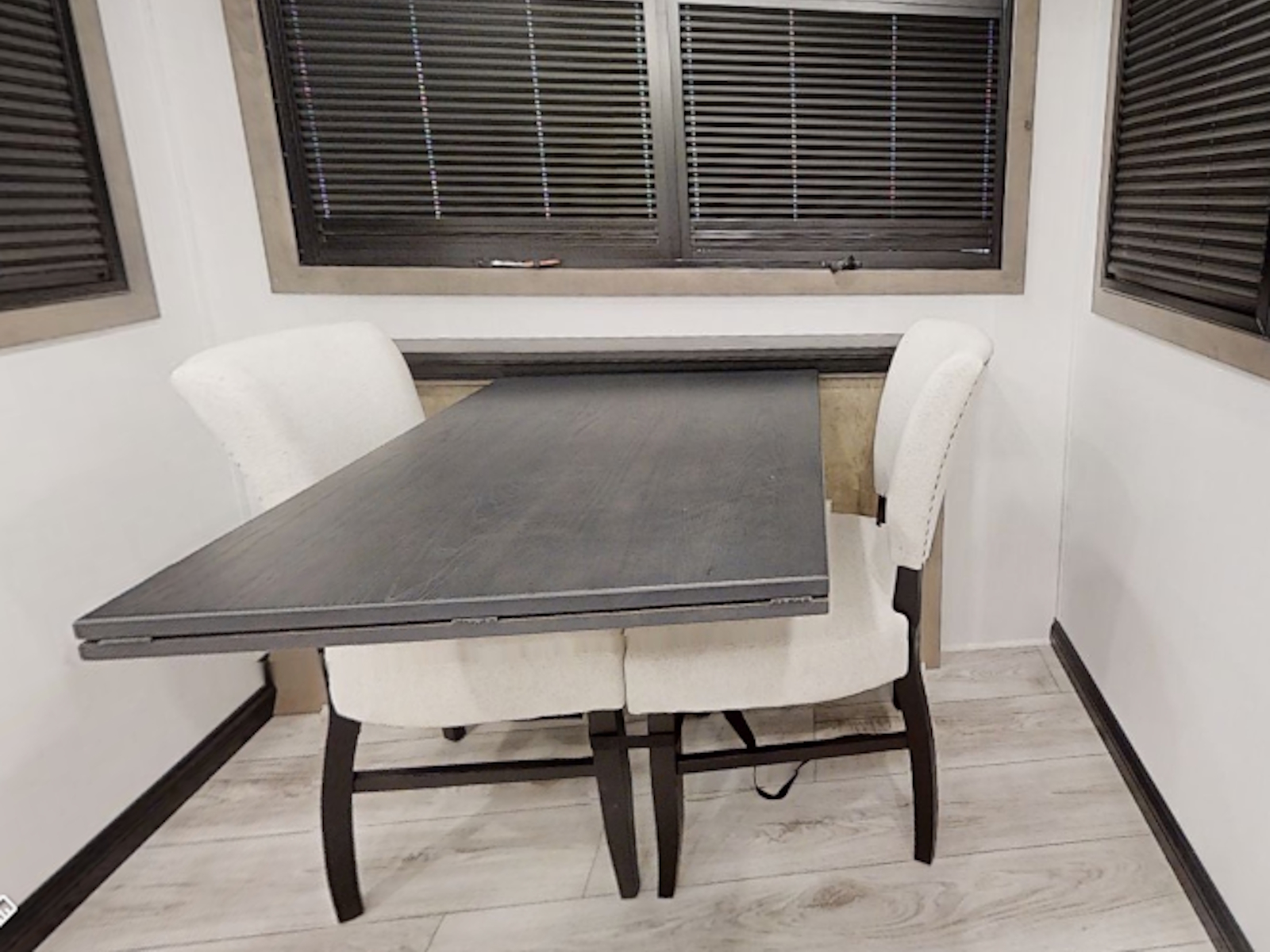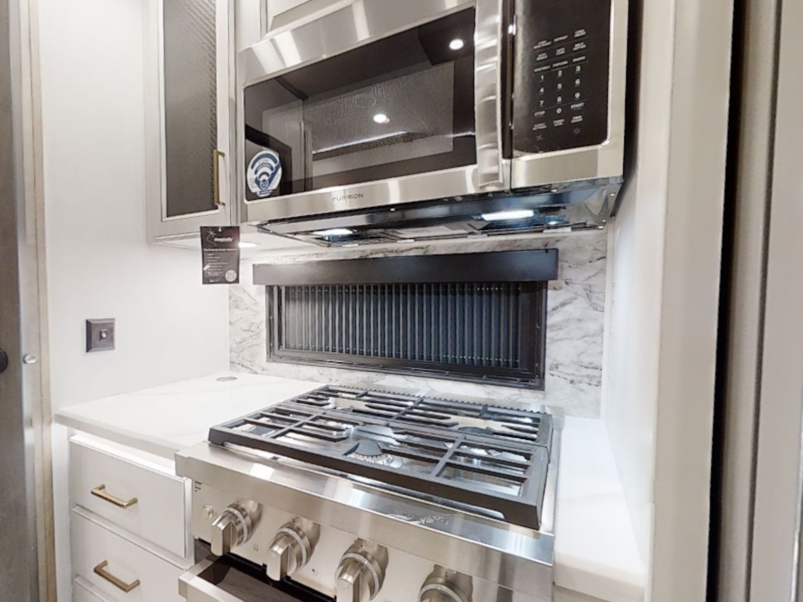Beauflor® vinyl flooring throughout | Hardwood decorative slideout fascia | Reflective window shades built into window | Hardwood decorative window frames | Hardwood cabinetry, stiles, & framing | La-Z-Boy Furniture Package | Decorative backlit crown molding in living area, hardwood base molding in hallway and living area | 5K BTU decorative fireplace heater | Central vacuum