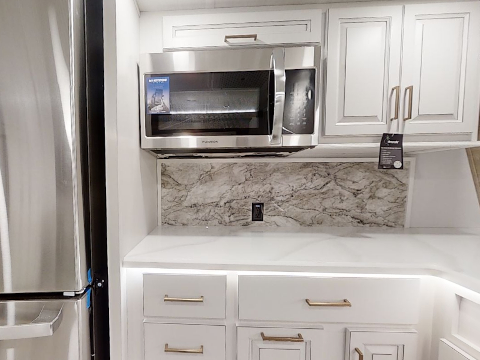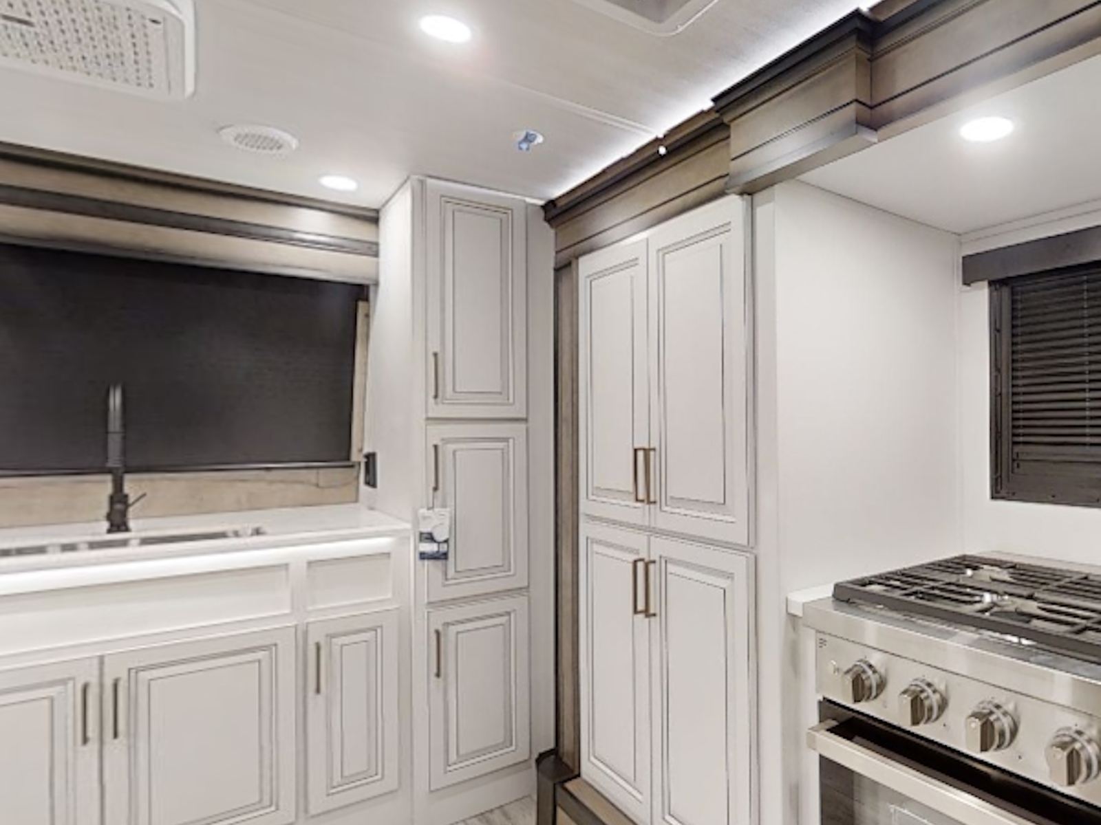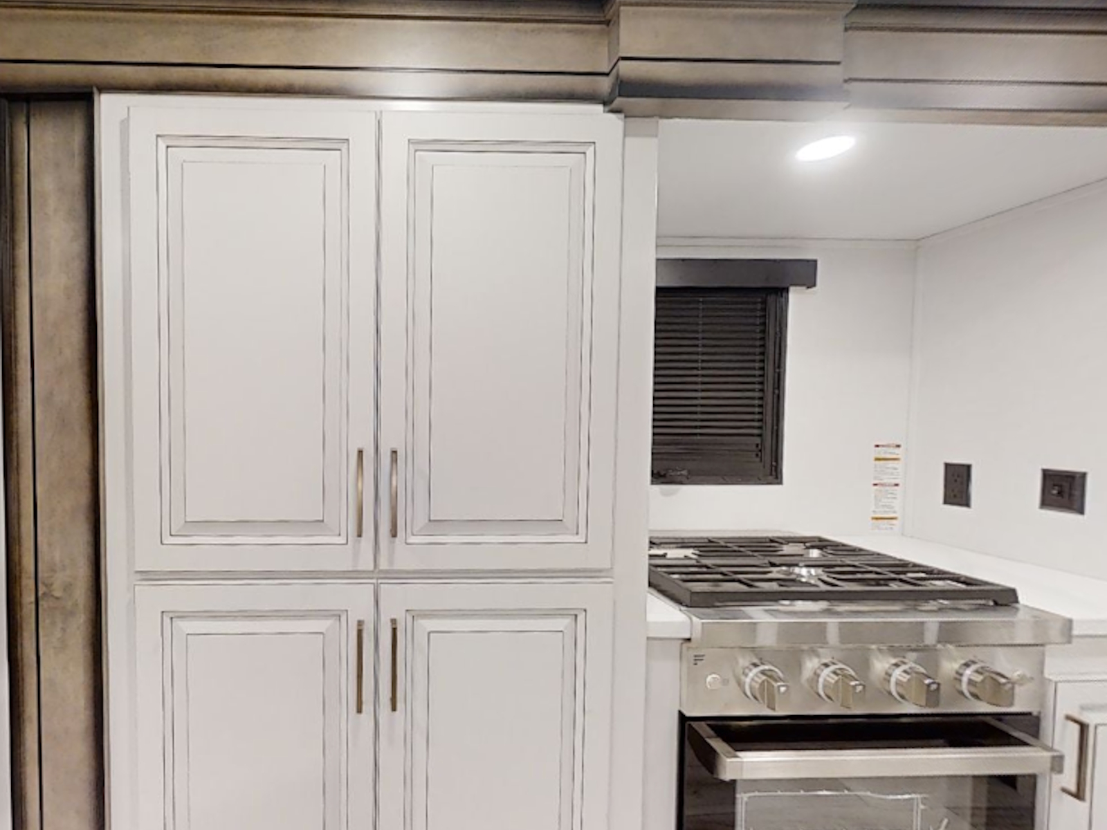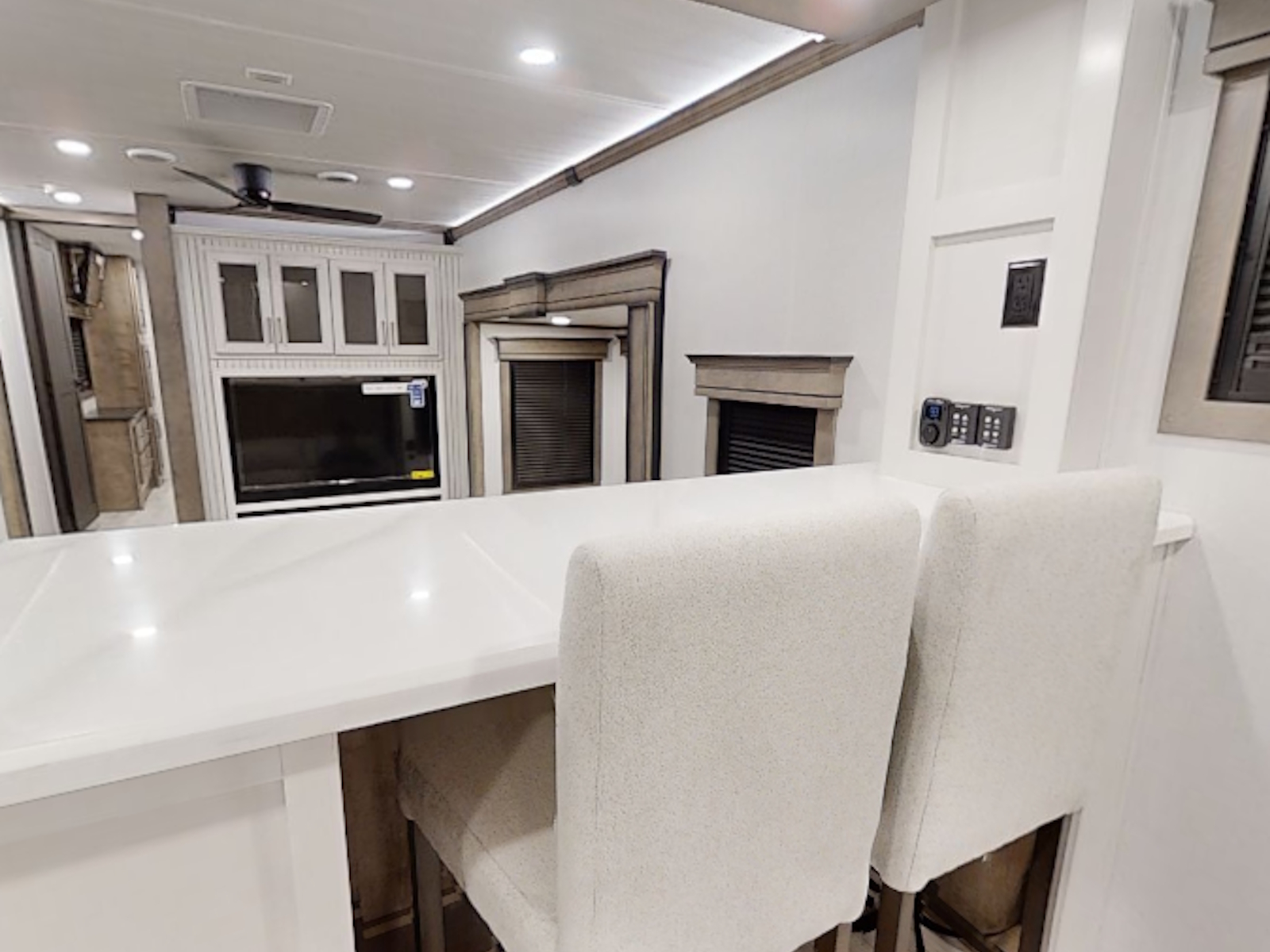Beauflor® vinyl flooring throughout | Hardwood decorative slideout fascia | Reflective window shades built into window | Hardwood decorative window frames | Hardwood cabinetry, stiles, & framing | La-Z-Boy Furniture Package | Decorative backlit crown molding in living area, hardwood base molding in hallway and living area | 5K BTU decorative fireplace heater | Central vacuum