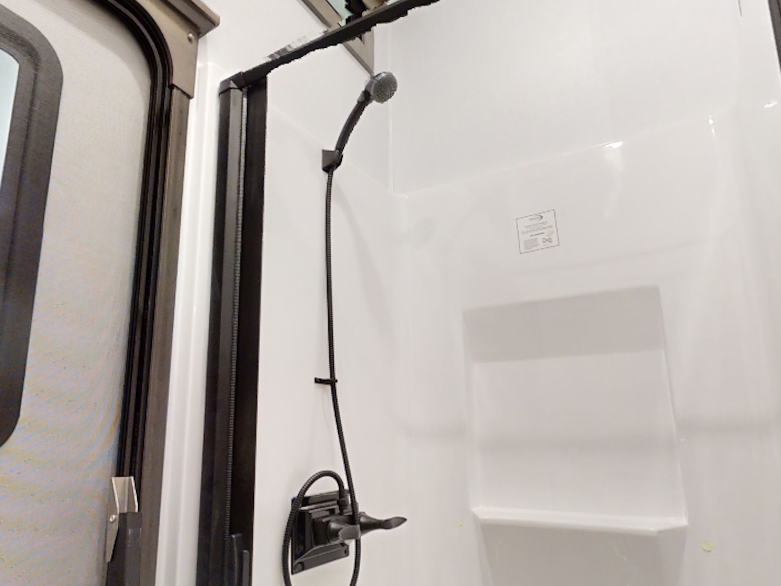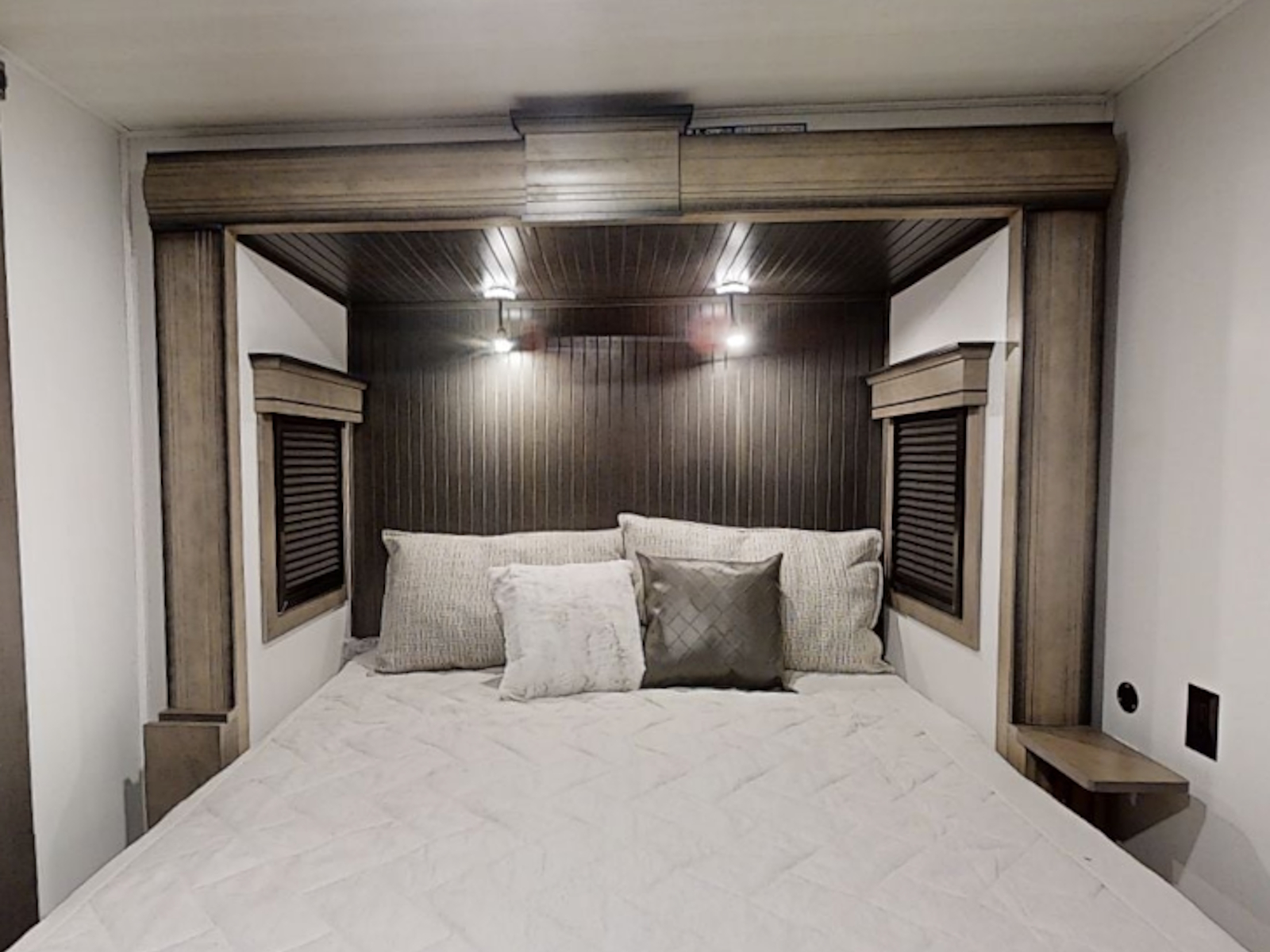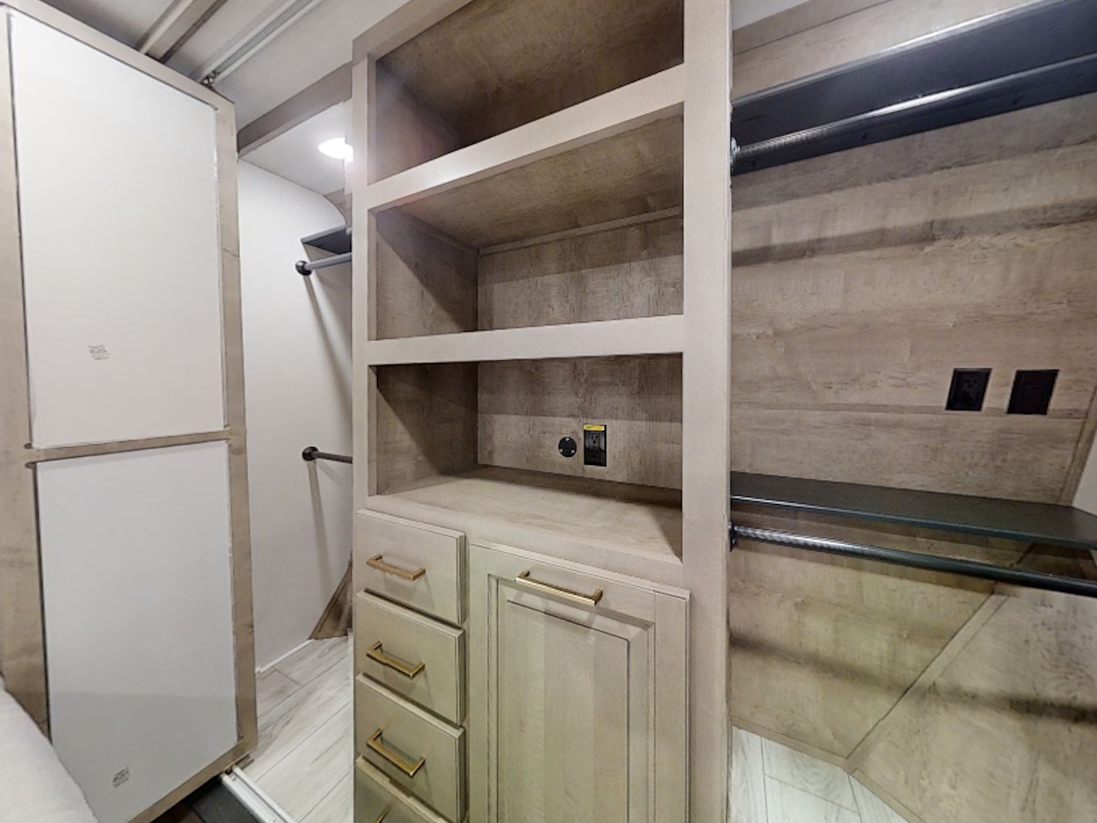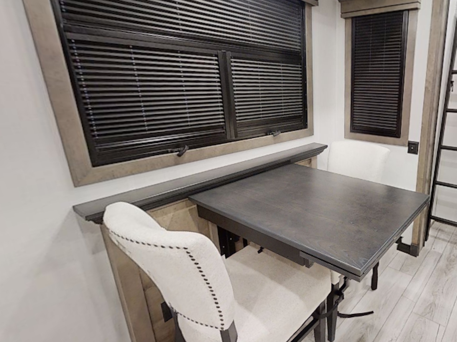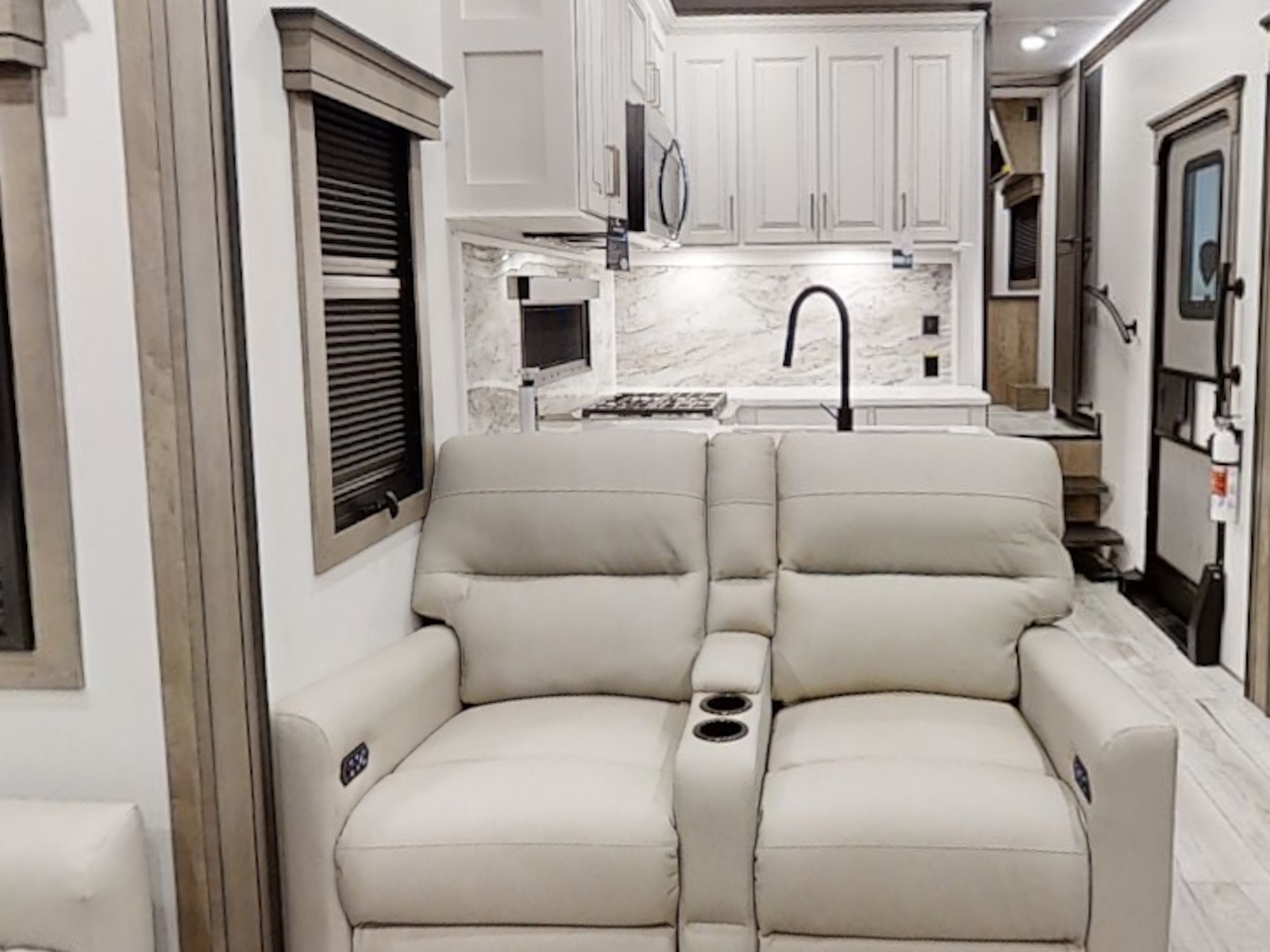Beauflor® vinyl flooring throughout | Hardwood decorative slideout fascia | Reflective window shades built into window | Hardwood decorative window frames | Hardwood cabinetry, stiles, & framing | La-Z-Boy Furniture Package | Decorative backlit crown molding in living area, hardwood base molding in hallway and living area | 5K BTU decorative fireplace heater | Central vacuum