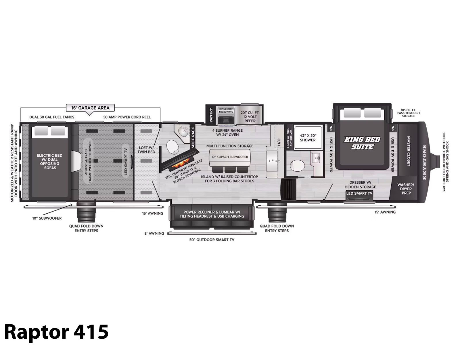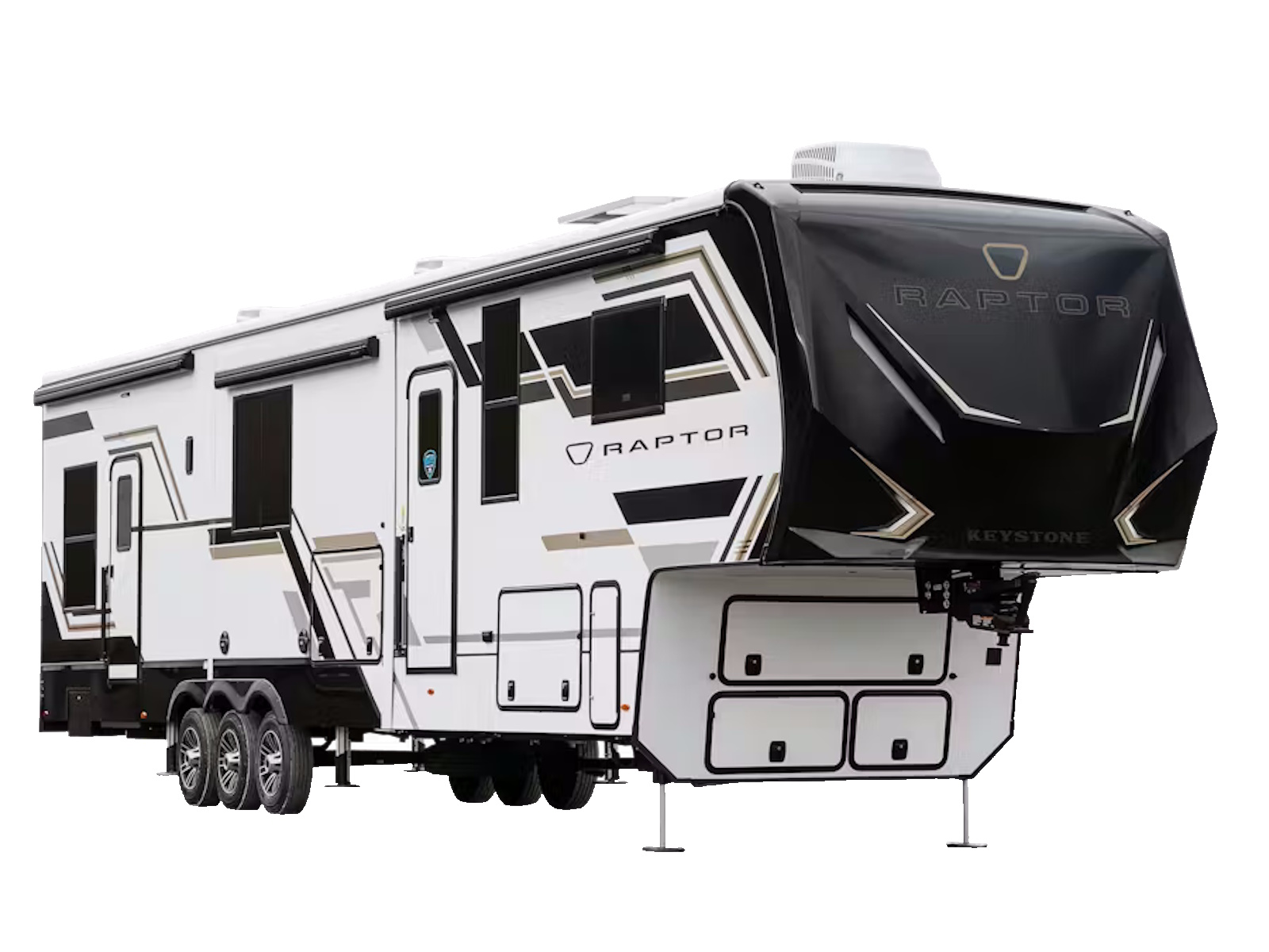 Raptor and Raptor Carbon Series set the standard for hardworking and innovative toy haulers. These Key Performance™ brands focus on flexible floorplans and large garages. Multi-zone living, sophisticated design and features like soft-close cabinets, wireless charging stations, and hot water on-demand make Raptor a favorite for extended camping. Carbon's burly construction and practical comfort are perfect for getting side-by-sides out to the trailhead. Both feature frame-welded tie-downs, painted front caps, EXCLUSIVE Omni-Chill™ A/C systems, hydraulic auto-leveling, and SolarFlex™ packages.