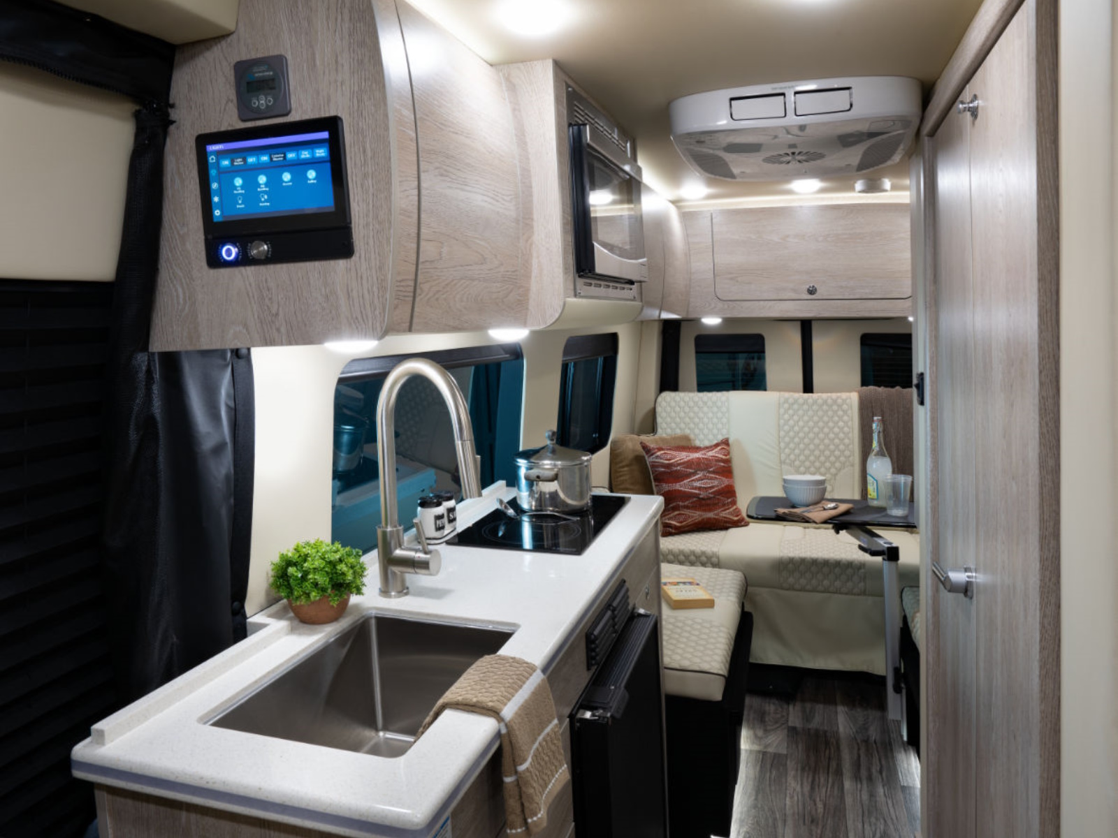 The Heritage distinguishes itself from the Patriot and Passage with some notable differences. The most noticeable feature of the Heritage is the integration of radius laminated cabinetry. This innovative cabinetry is not only durable, but also introduces a fresh design element. With the new cabinetry, the Heritage boasts ambient halo lighting, creating a warm and inviting atmosphere for the customer’s travels.