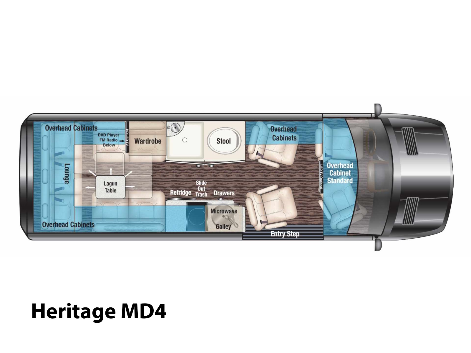 The Heritage distinguishes itself from the Patriot and Passage with some notable differences. The most noticeable feature of the Heritage is the integration of radius laminated cabinetry. This innovative cabinetry is not only durable, but also introduces a fresh design element. With the new cabinetry, the Heritage boasts ambient halo lighting, creating a warm and inviting atmosphere for the customer’s travels.