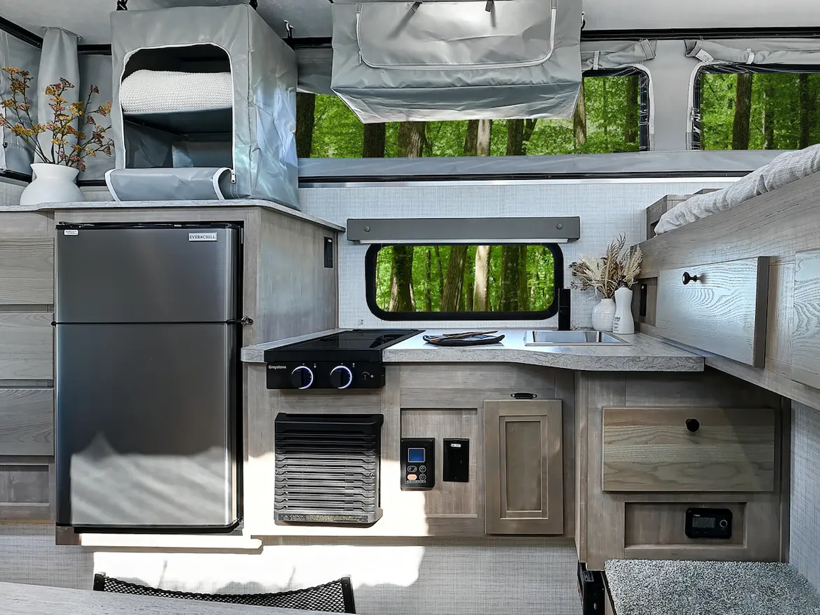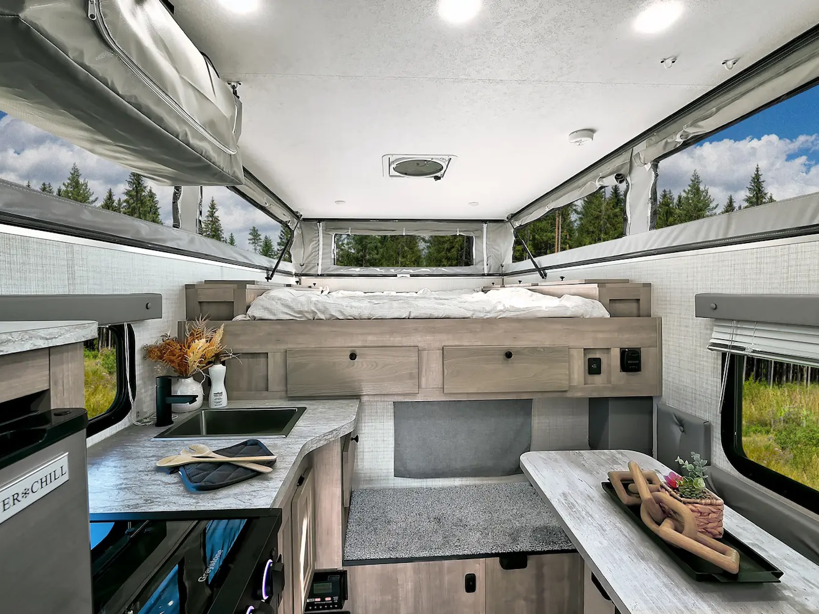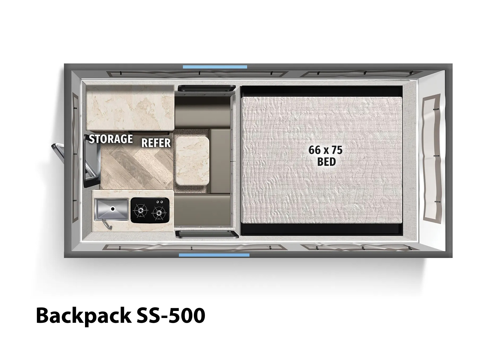 No matter the size of your truck, we have a soft-side truck camper perfect for you. Thanks to the electric lift you can easily set up your camper without hand-cranking the top up or down. And with the optional remote, it works with just a push of a button. Plus, our 55” one-piece door makes it that much easier to enter and exit the camper, compared to our competition’s 46” or 47” door. The soft-side series comes in a white or grey gel coat exterior.