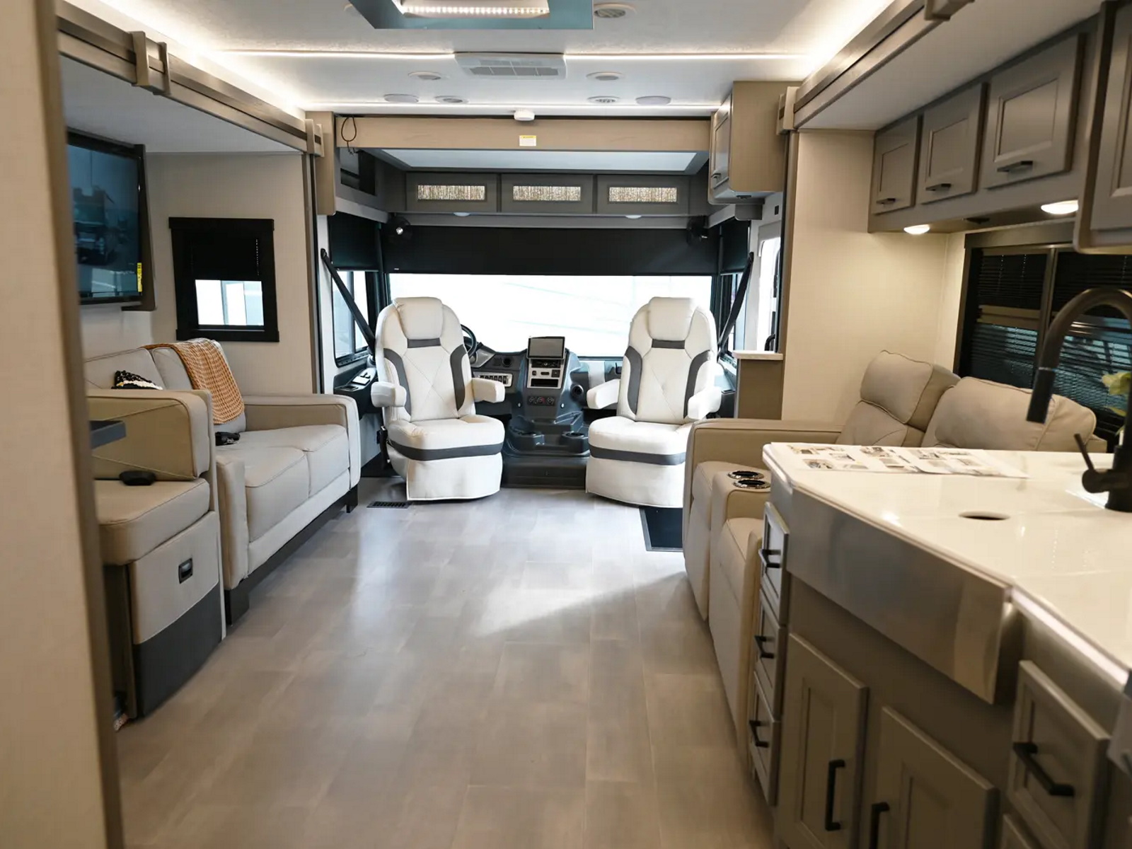 The Encore 355DS offers a double-slide design and a spacious living area that feels open and comfortable. This 36-foot motorhome makes relaxing after a day of hiking or kayaking easy, with premium finishes, kitchen amenities, and sleeping space for your crew. With its 350 hp engine and strong build, it’s a luxurious and capable companion for extended road journeys.