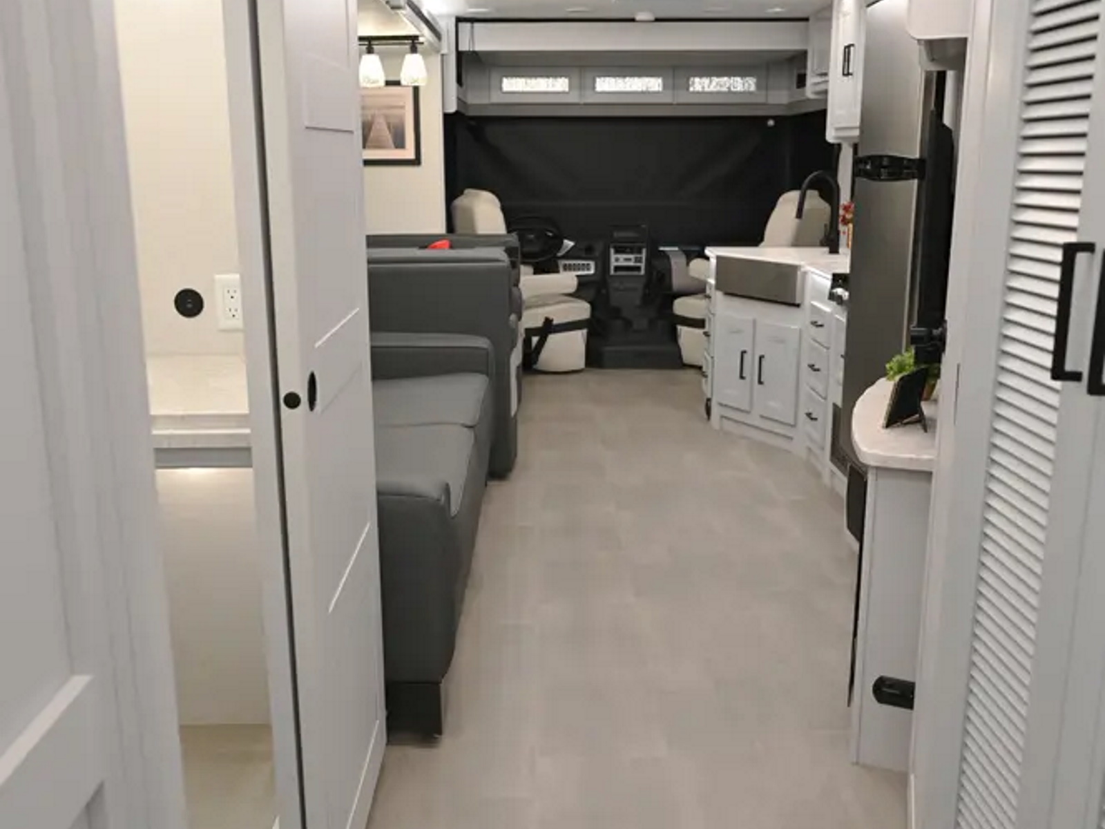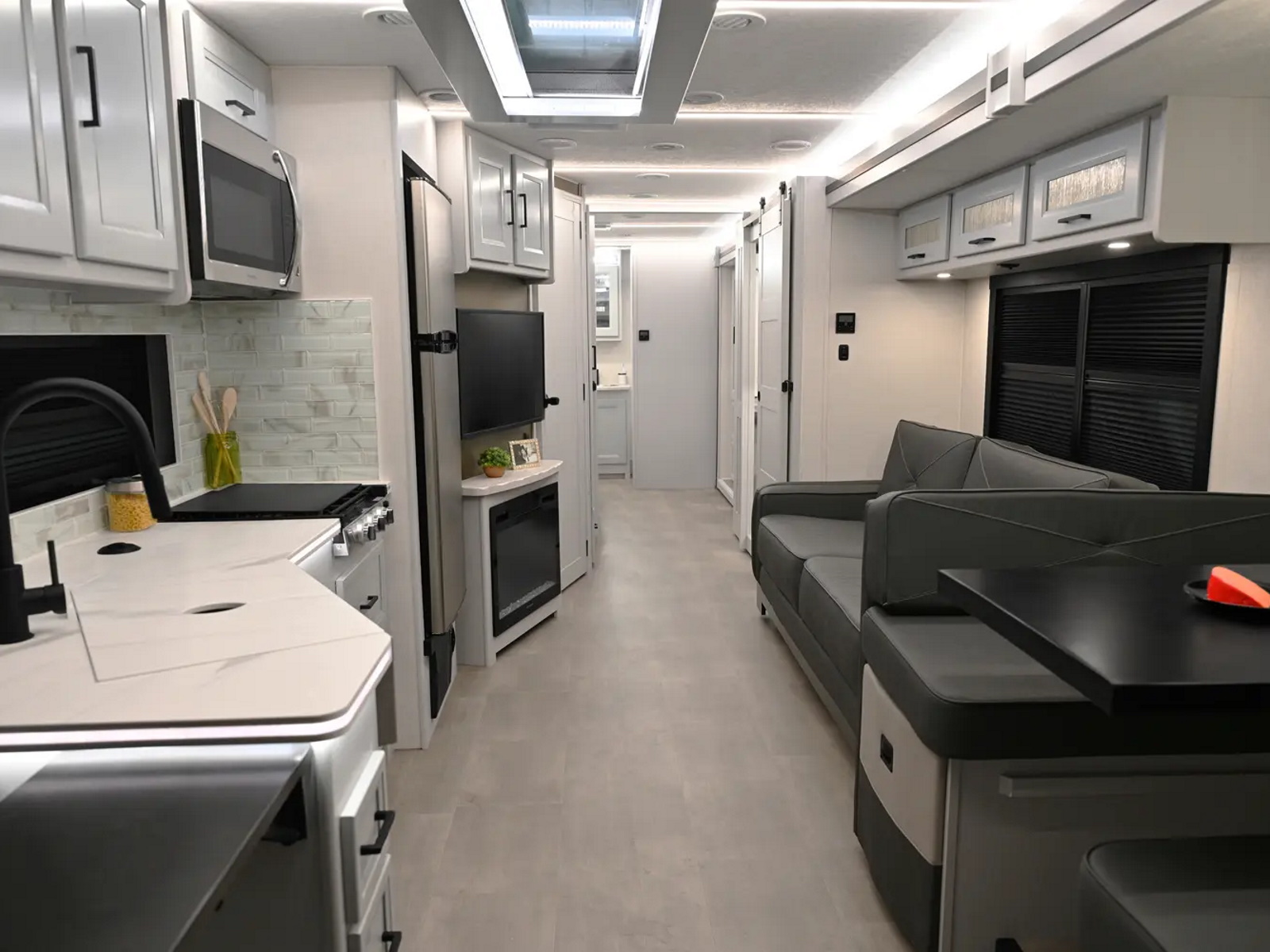 The Encore 375RB is a roomier 38-foot floor plan that gives you a private rear bedroom, generous storage, and a front lounge area. Its layout is ideal for longer trips, offering space to unwind after outdoor adventures like trail hikes, lakeside camping, or national park excursions. The powerful gas engine and high-capacity tanks make extended travel smooth and stress-free.