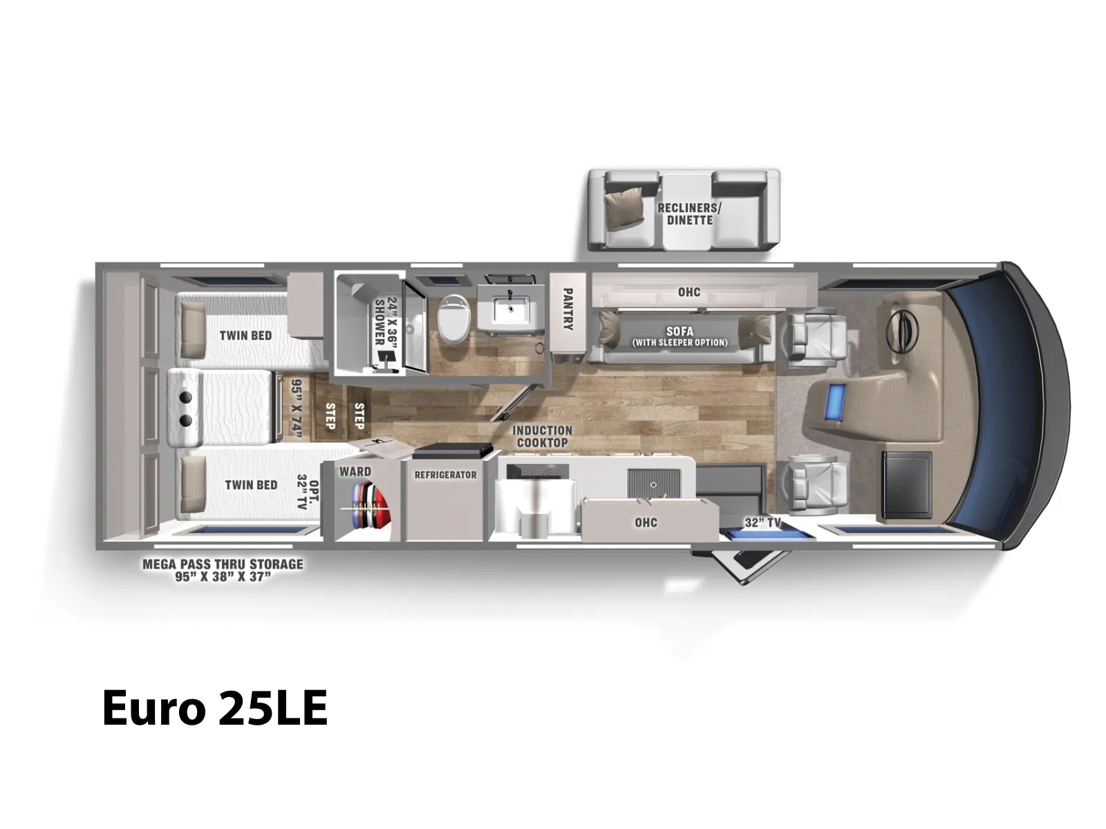 The Euro 25LE is designed for agile cruising without sacrificing comfort. At 28' 4", it’s easier to maneuver through campgrounds and scenic routes, yet built with premium features like solid-surface counters, stainless steel refrigerator, and a gas-powered drivetrain ready for long road trips. The efficient layout supports effortless adventures and weekend escapes to nature.