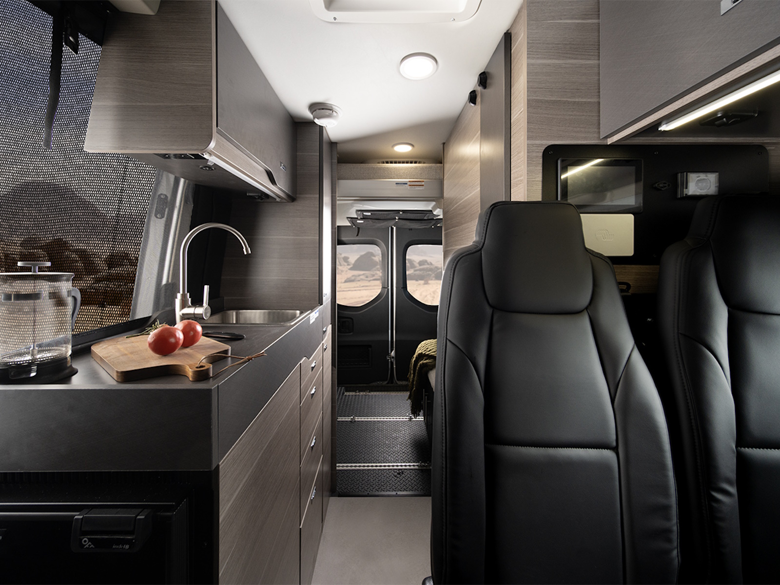 Inside, the Terrain’s cabinetry offers a sleek, modern look that’s as functional as it is stylish. An integrated countertop extension expands your prep space when needed and folds away to keep the space open. The dual bench seat includes two seatbelts and slide-and-recline features for a more comfortable and flexible ride. For those who don't need to seat more than two, an optional workstation in place of the dual bench seats provides an excellent space to work on the road. If you are working remotely, you'll stay connected from almost anywhere thanks to the standard Starlink satellite internet system. Enjoy the breeze without the bugs thanks to custom-fit screens for the side and rear doors, letting you take in the outdoors without uninvited guests.