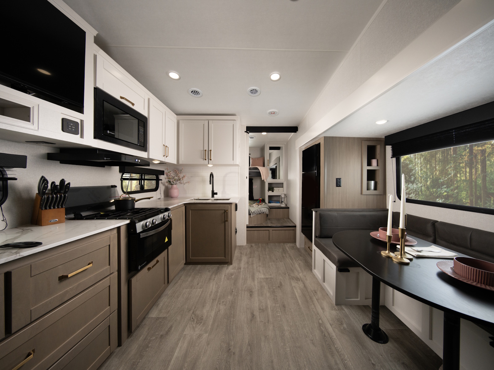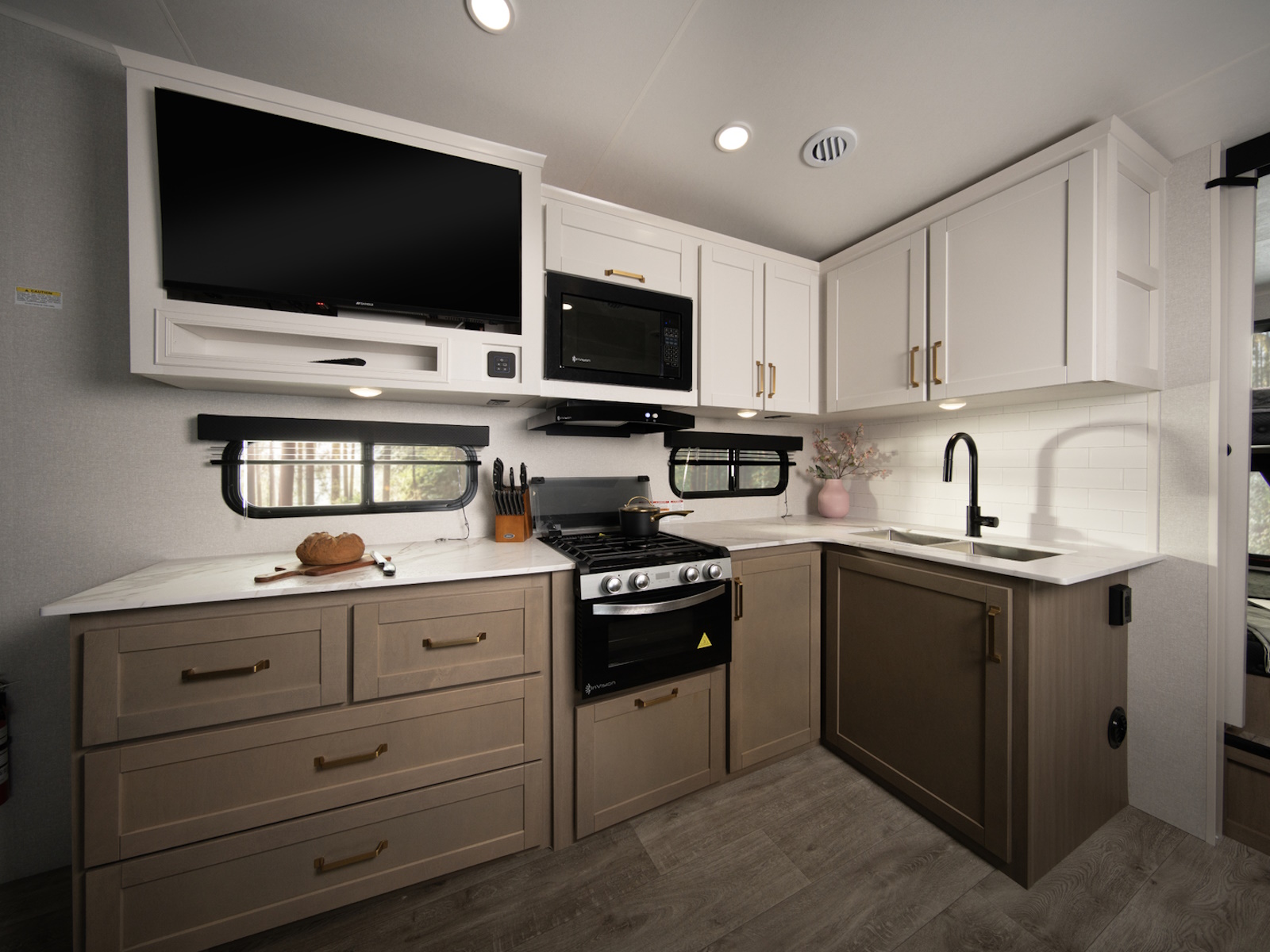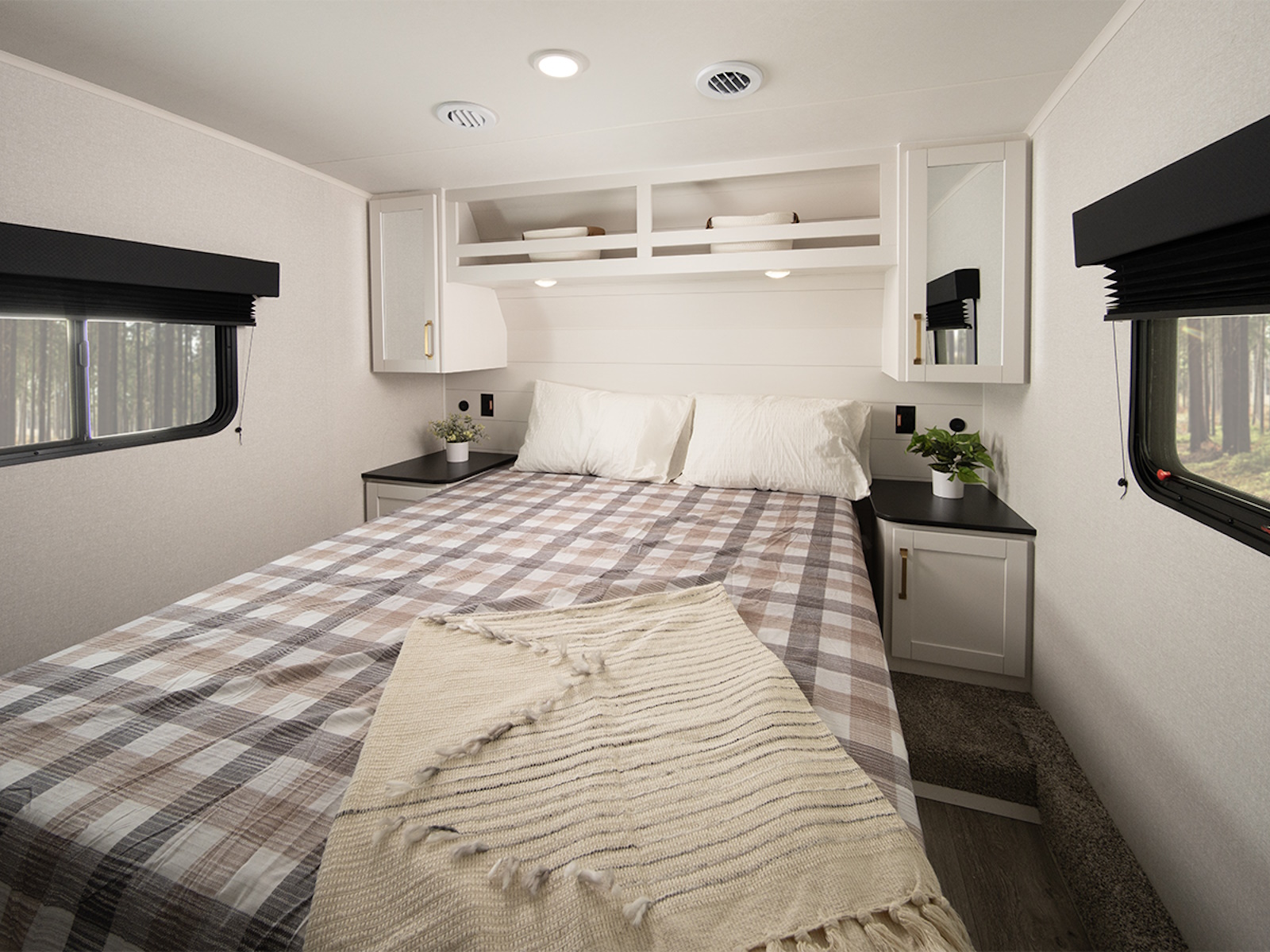 After a day of hiking, fishing, or exploring new destinations, retreat to the private master suite, where high-end finishes and smart design guarantee a restful night’s sleep. Gas-strutted under-bed storage provides extra room for all your essentials, and the design of the bed area is prepped for added convenience, including space for a CPAP machine. Panoramic windows let in natural light and fresh air, creating a breezy, open feel.
