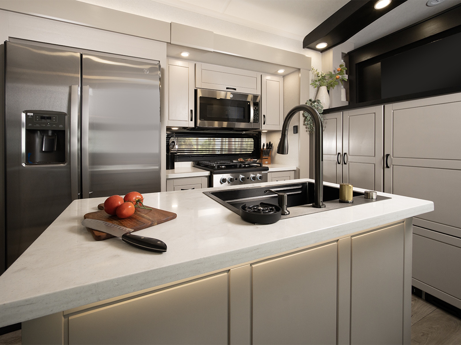 At camp, the 102-inch wide-body frame opens up to reveal a spacious interior rich with residential-grade finishes. Culinary conveniences abound with GE® Profile appliances, including a 21-cu. ft. refrigerator, 30-inch convection microwave with air fryer and a 24-inch gas range—bringing the full kitchen experience on the road. Relax in style with true residential furnishings, a JBL® sound system with subwoofer and a cozy electric fireplace, all designed for ultimate comfort and downtime.
