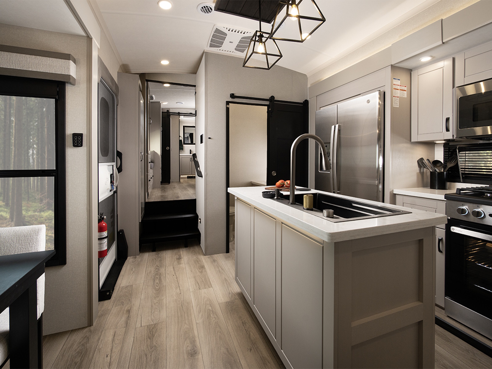 At camp, the 102-inch wide-body frame opens up to reveal a spacious interior rich with residential-grade finishes. Culinary conveniences abound with GE® Profile appliances, including a 21-cu. ft. refrigerator, 30-inch convection microwave with air fryer and a 24-inch gas range—bringing the full kitchen experience on the road. Relax in style with true residential furnishings, a JBL® sound system with subwoofer and a cozy electric fireplace, all designed for ultimate comfort and downtime.