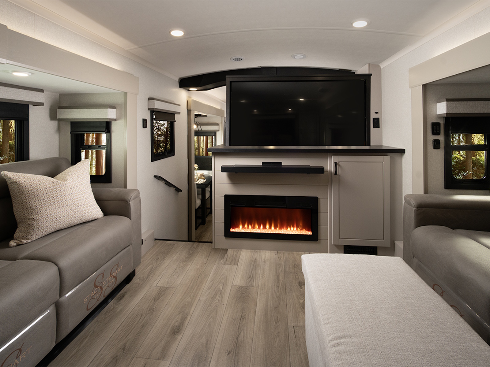 At camp, the 102-inch wide-body frame opens up to reveal a spacious interior rich with residential-grade finishes. Culinary conveniences abound with GE® Profile appliances, including a 21-cu. ft. refrigerator, 30-inch convection microwave with air fryer and a 24-inch gas range—bringing the full kitchen experience on the road. Relax in style with true residential furnishings, a JBL® sound system with subwoofer and a cozy electric fireplace, all designed for ultimate comfort and downtime.