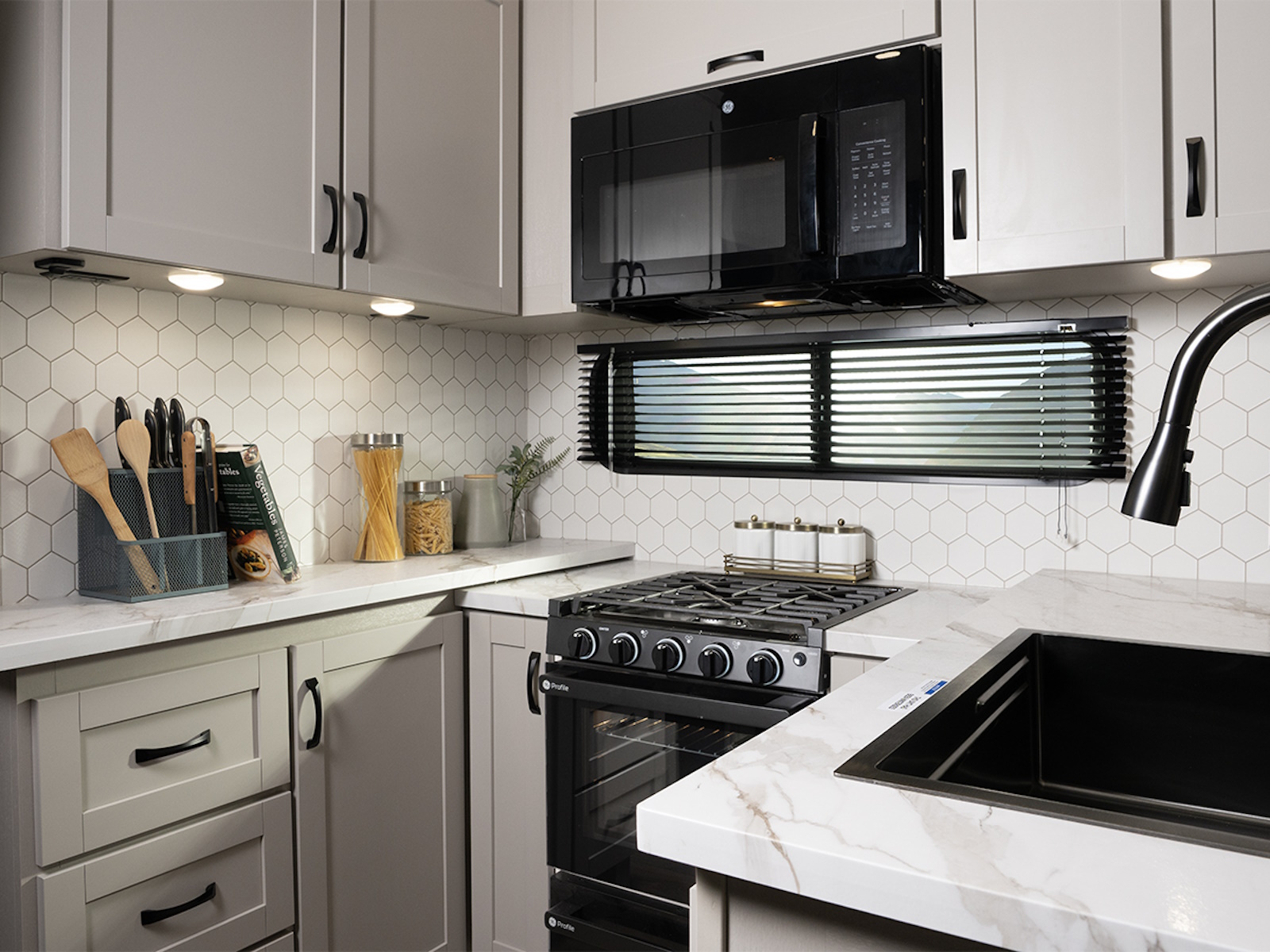 Power is never an issue with the NPS-powered Yamaha 6,000W generator and the Overlander II Solar Package featuring two roof-mounted 200W solar panels, 30AMP Digital PWM Solar Controller, and an 1800W inverter. Inside, residential-style luxury awaits with an Olympic 66” x 80” bed, handcrafted hardwood cabinetry, and a SuperSofa or theater seats with heat, massage, and LED lighting (select models). The kitchen boasts a residential refrigerator, 30-inch space-saver microwave, and a residential 21-inch oven.