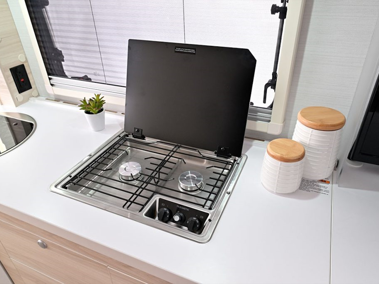This teardrop camper features a large sleeping area. The roomy dinette can also be converted into a secondary sleeping area. Prepare a meal in the fully equipped kitchen with a 2-burner stove and a microwave. This unit also offers a wet bath, toilet, shower, and ample storage space.