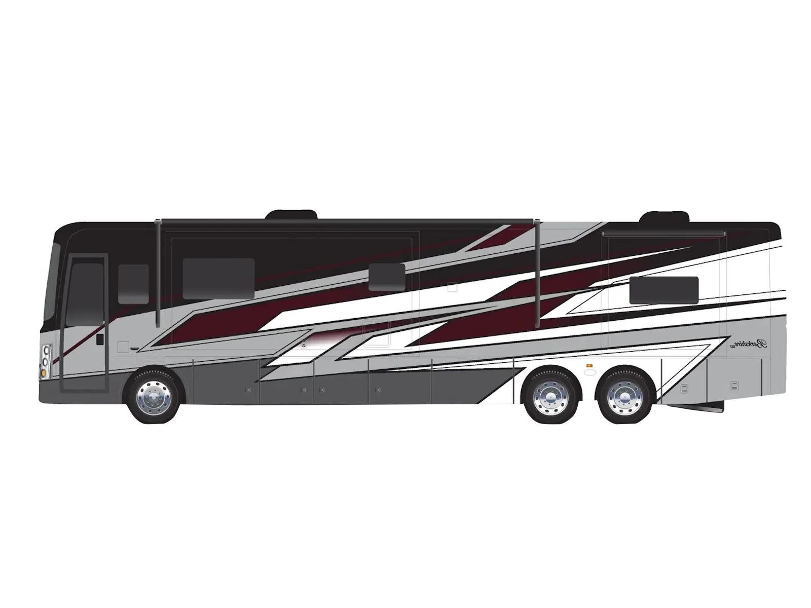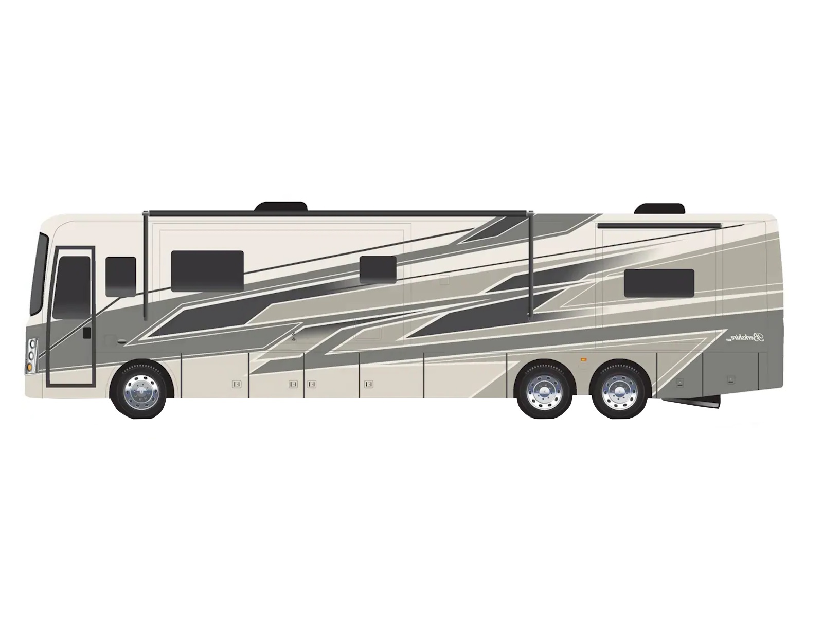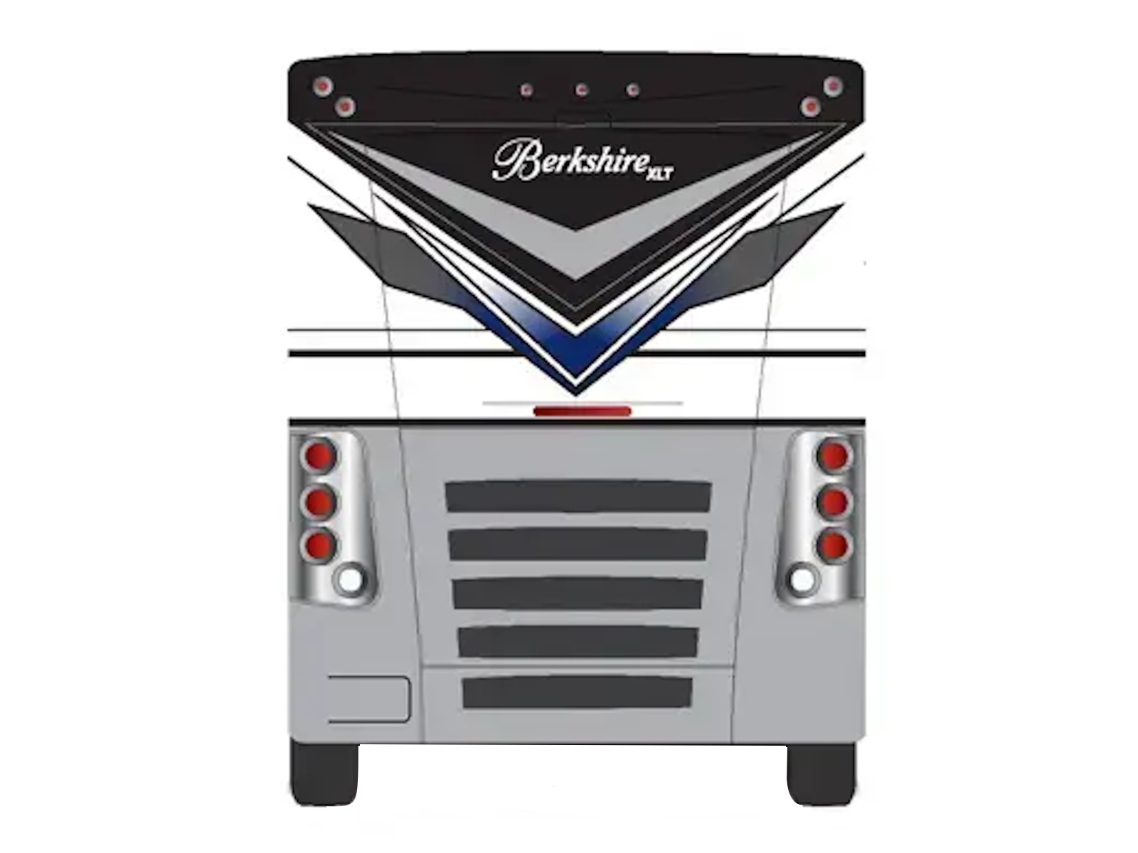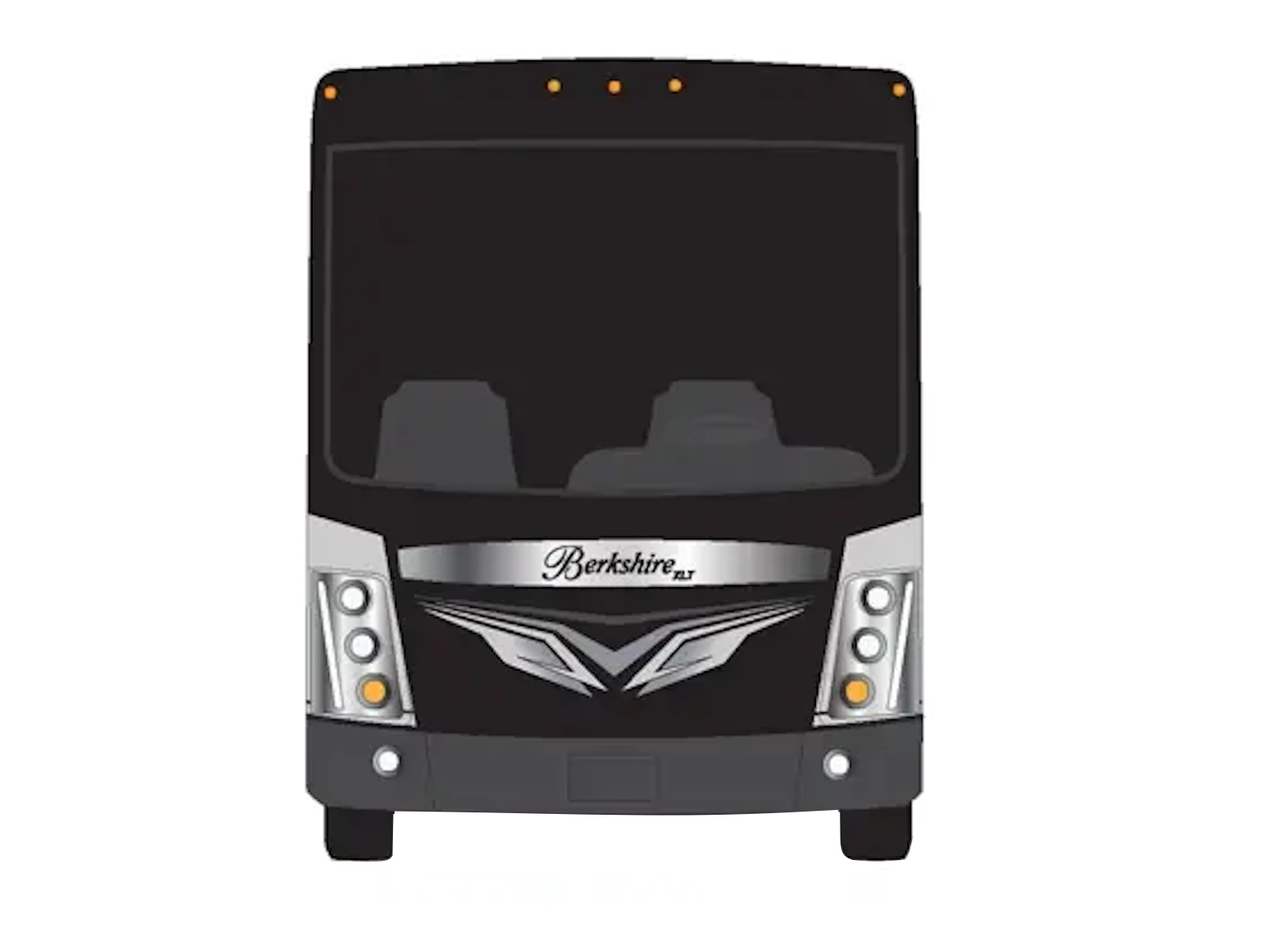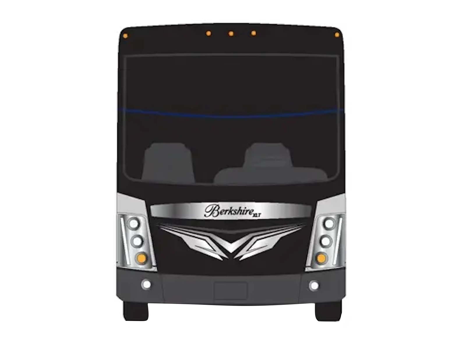 The Berkshire XLT 45E is a five-slide bunkhouse model. The large full rear bath includes a shower, vanity, cabinets, and stacking washer/dryer. Within the bathroom is a slideout bunk room/wardrobe combo. Each bunk is 30" x 73" and has its own TV. The main bedroom has a slideout, 72" x 80" Tilt-a-View king bed, plus a dresser, wardrobe cabinet, 43" TV, and overhead cupboards. Moving toward the living area is a half bath with vanity sink, medicine cabinet, and commode. The kitchen is fully equipped with a convection microwave, induction cooktop, and residential-style refrigerator. Just over the cockpit, you'll find a unique drop-down bed that provides an additional sleeping surface.