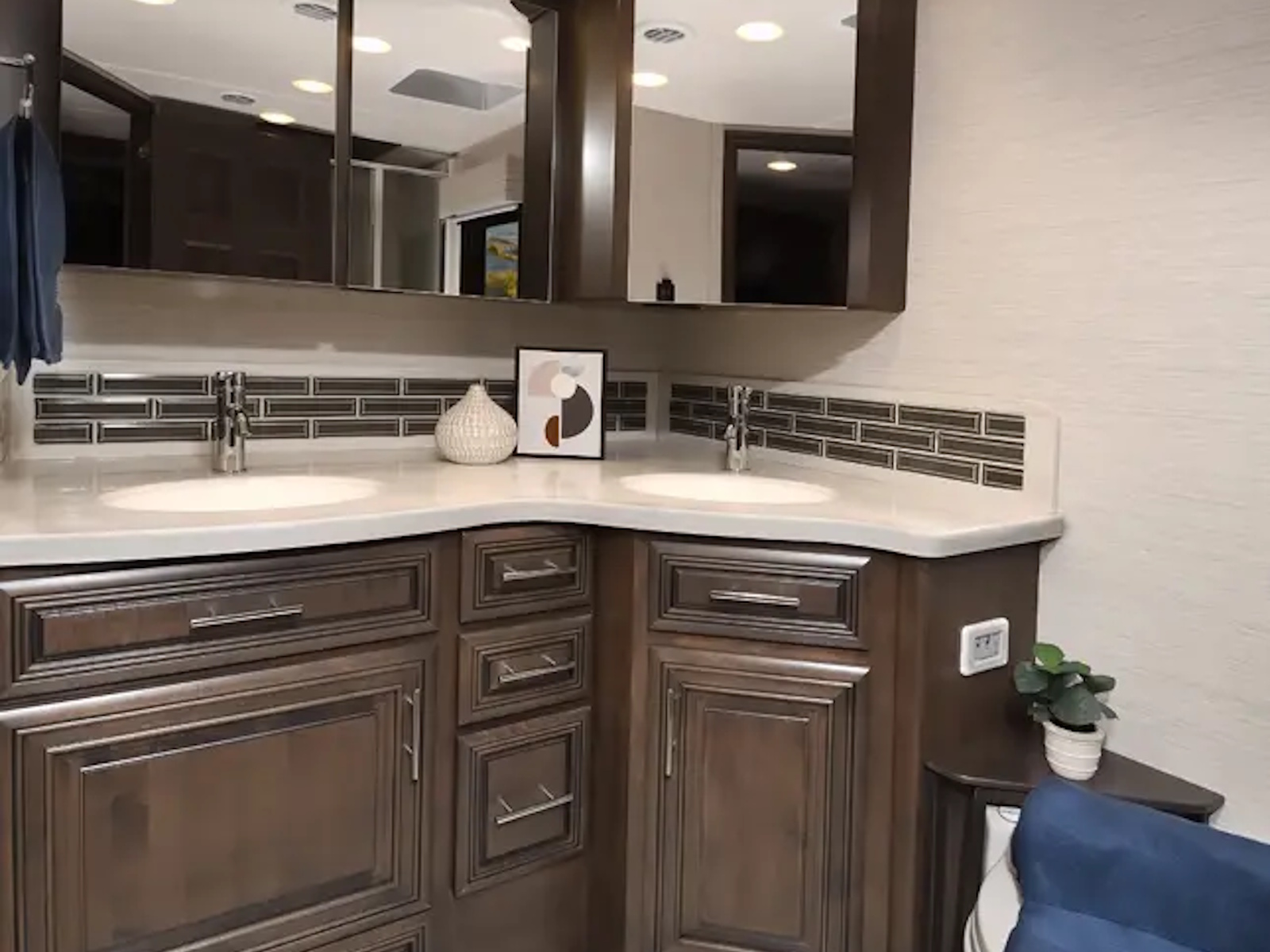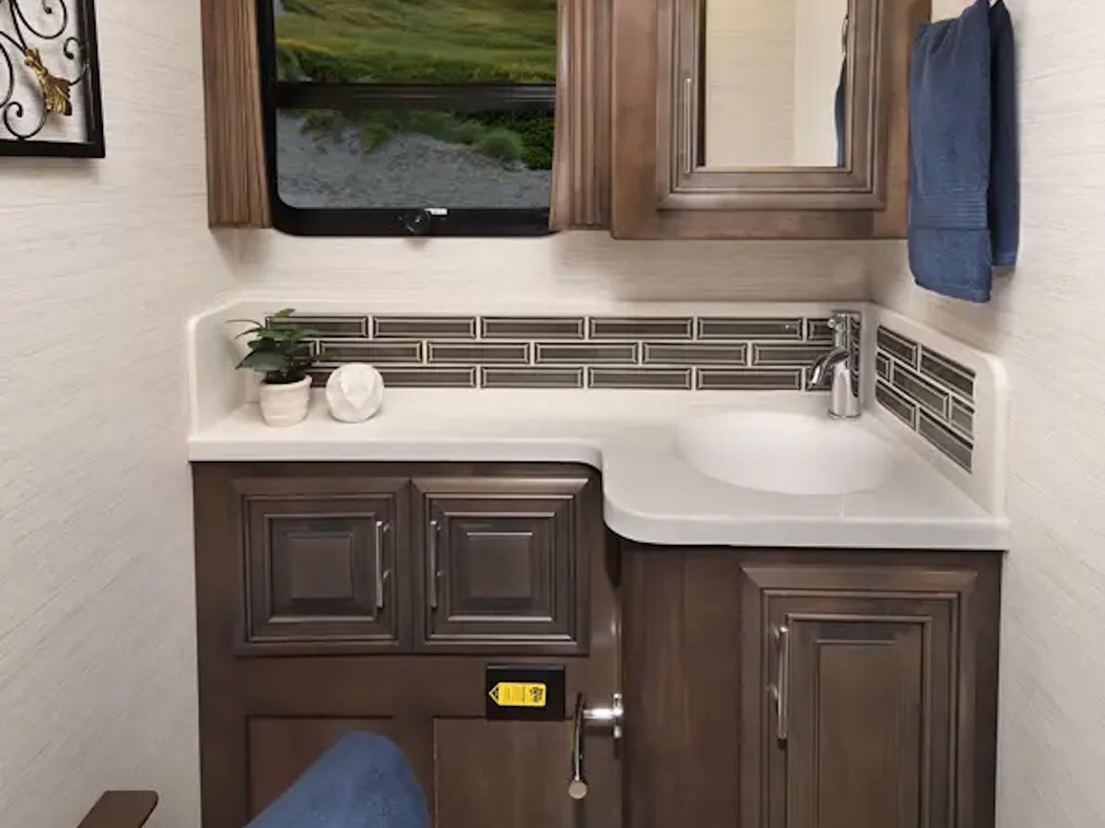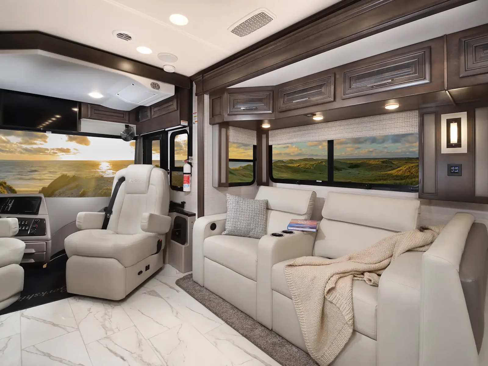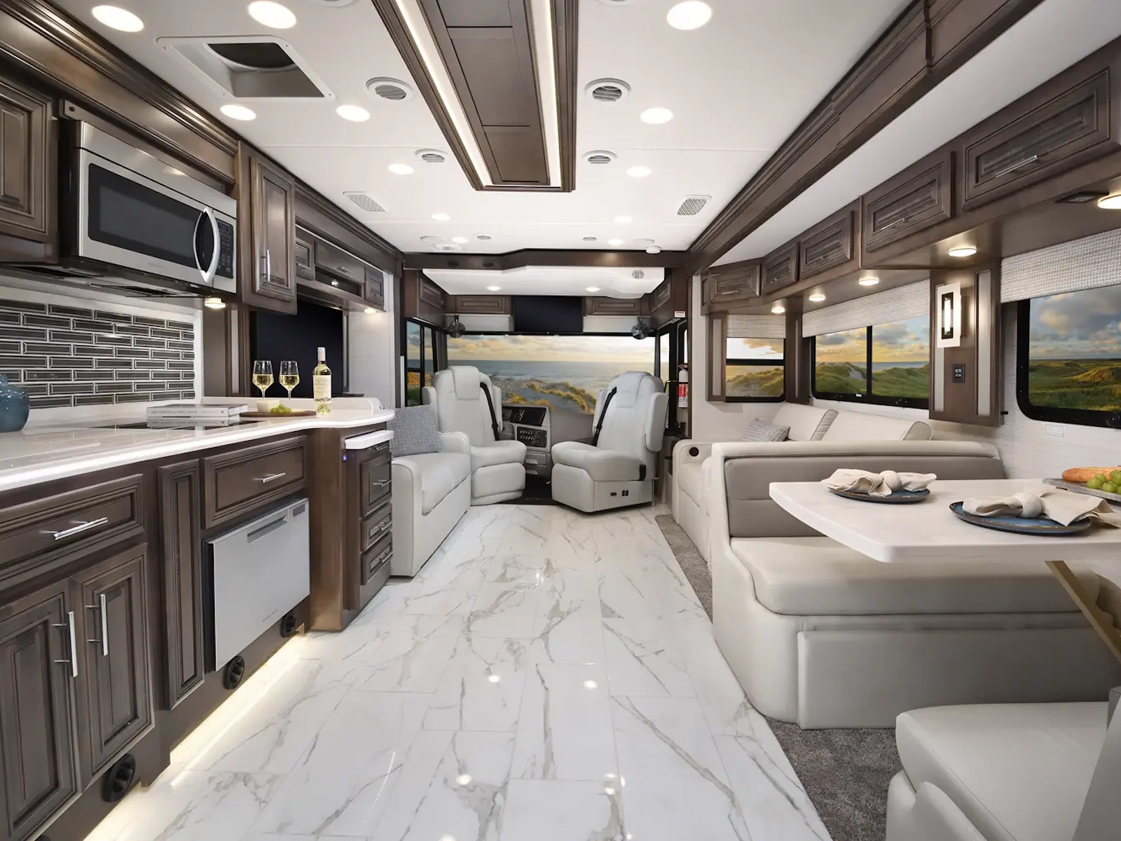 The Berkshire XLT 45E is a five-slide bunkhouse model. The large full rear bath includes a shower, vanity, cabinets, and stacking washer/dryer. Within the bathroom is a slideout bunk room/wardrobe combo. Each bunk is 30" x 73" and has its own TV. The main bedroom has a slideout, 72" x 80" Tilt-a-View king bed, plus a dresser, wardrobe cabinet, 43" TV, and overhead cupboards. Moving toward the living area is a half bath with vanity sink, medicine cabinet, and commode. The kitchen is fully equipped with a convection microwave, induction cooktop, and residential-style refrigerator. Just over the cockpit, you'll find a unique drop-down bed that provides an additional sleeping surface.