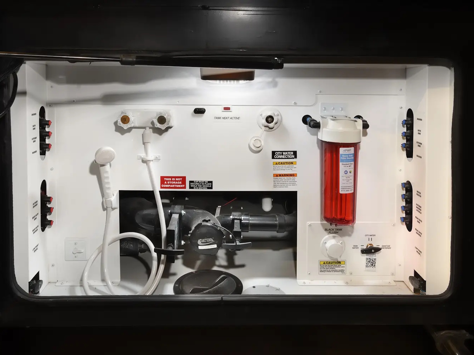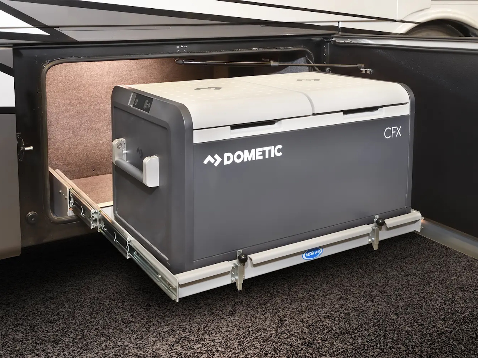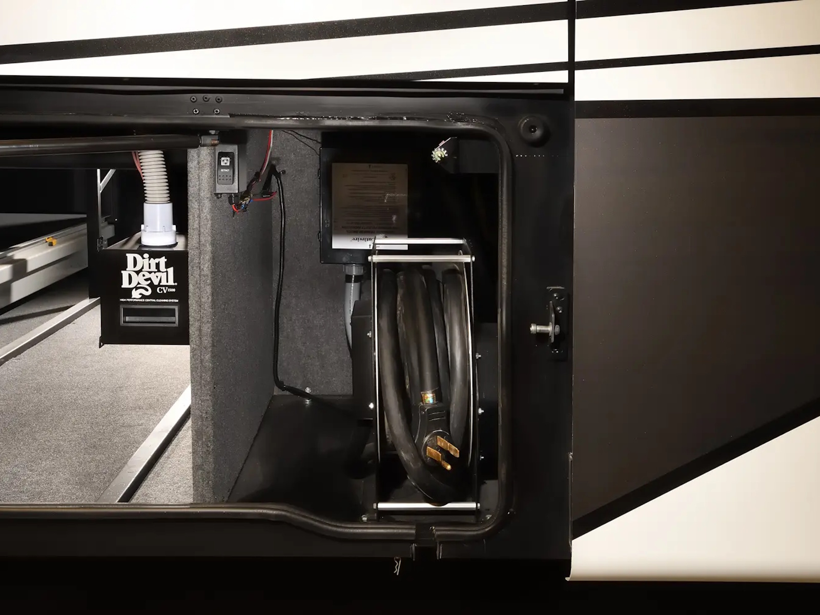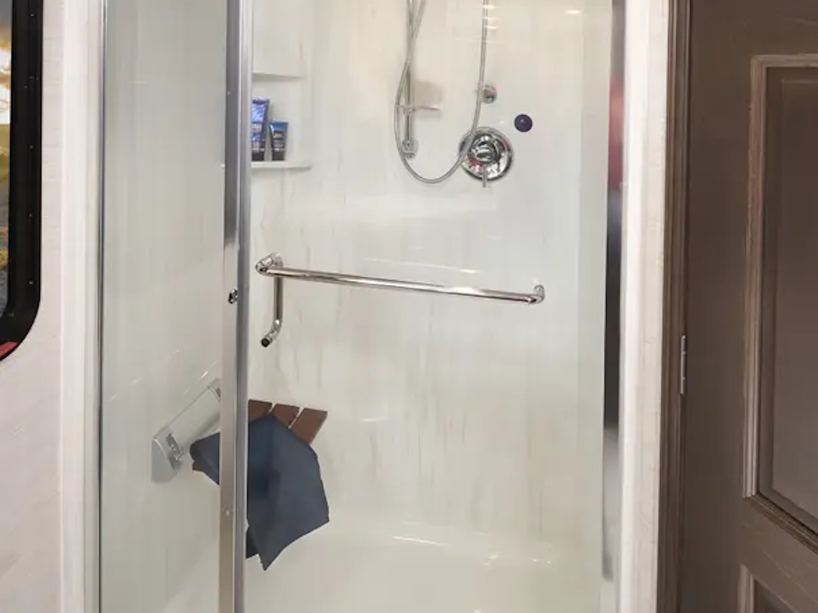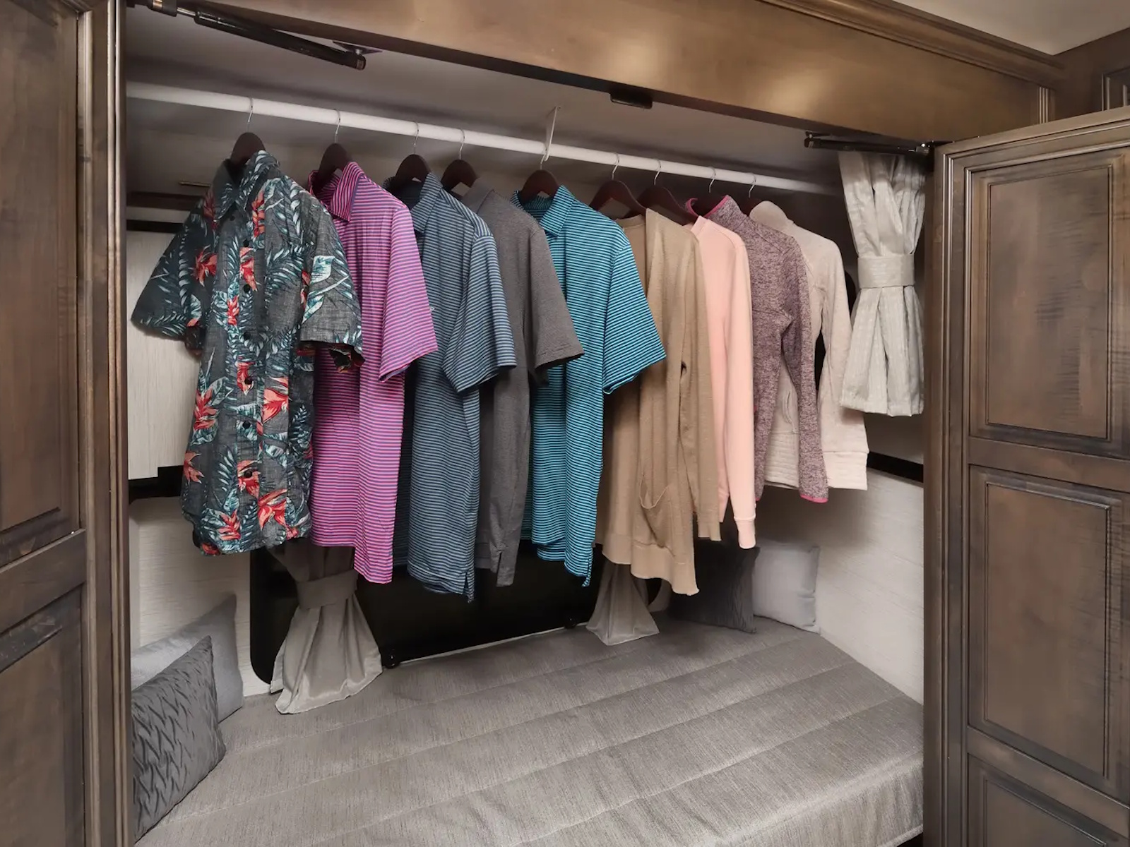 The Berkshire XLT 45E is a five-slide bunkhouse model. The large full rear bath includes a shower, vanity, cabinets, and stacking washer/dryer. Within the bathroom is a slideout bunk room/wardrobe combo. Each bunk is 30" x 73" and has its own TV. The main bedroom has a slideout, 72" x 80" Tilt-a-View king bed, plus a dresser, wardrobe cabinet, 43" TV, and overhead cupboards. Moving toward the living area is a half bath with vanity sink, medicine cabinet, and commode. The kitchen is fully equipped with a convection microwave, induction cooktop, and residential-style refrigerator. Just over the cockpit, you'll find a unique drop-down bed that provides an additional sleeping surface.