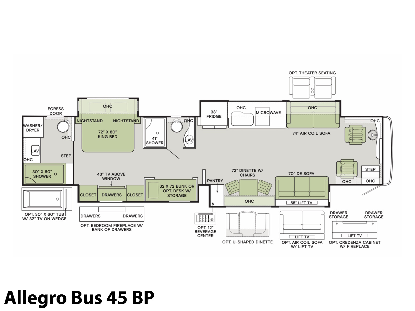 Give yourself something you deserve: Unforgettable travel in unmatched luxury. The 2026 Allegro Bus makes that happen. Between the four floor plans, ranging from 38′ to 45′, each offers something unique that fits to any lifestyle. Built on the exclusive PowerGlide XC raised rail chassis, the Allegro Bus provides comfort and safety on and off the road, wherever your travels may take you. For the 2026 Allegro Bus, we’re introducing PowerDrive, an enhanced steering column offering better handling, drivability, and maneuverability, giving you the confidence to “Drive with Power.”